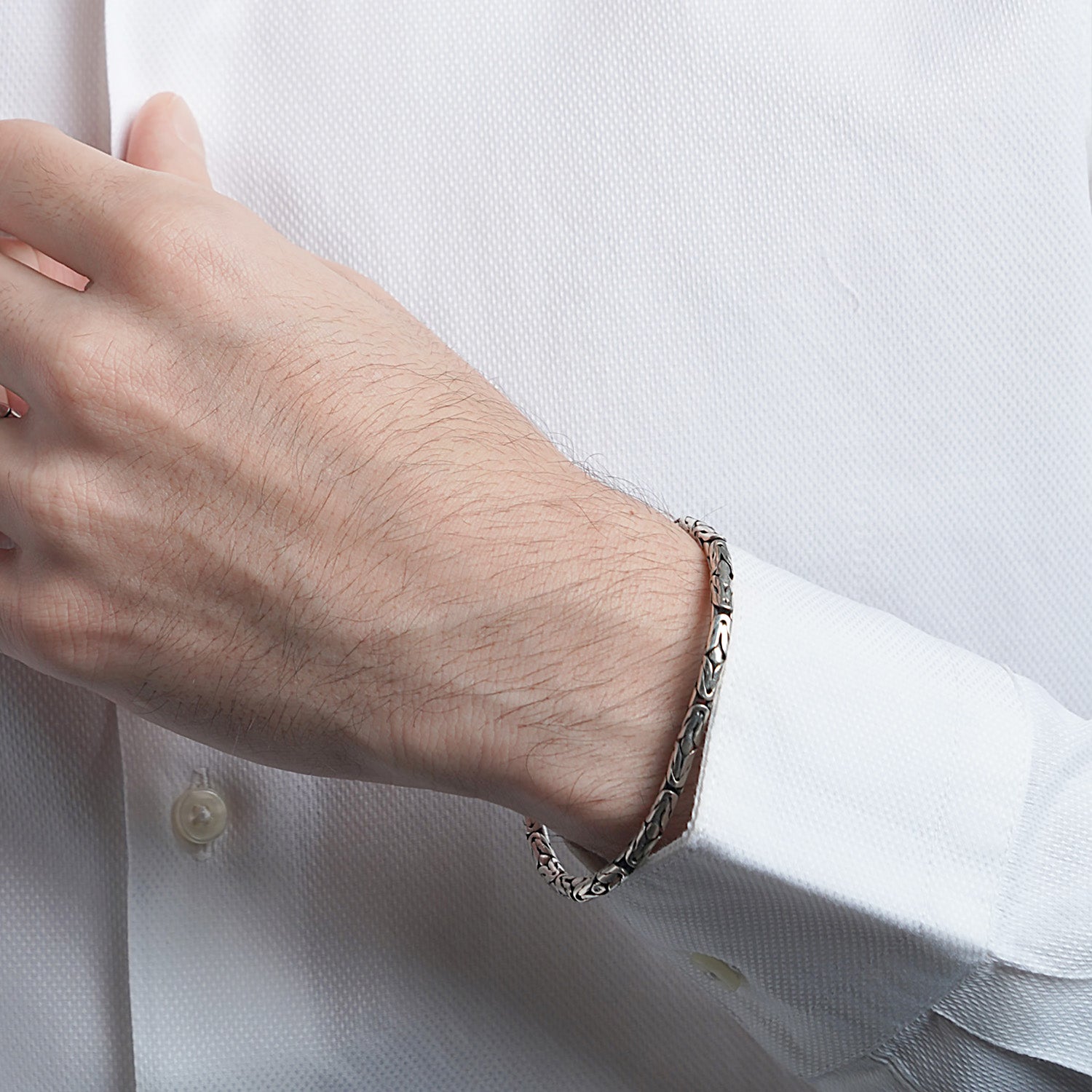• Intricately crafted in oxidized 925 sterling silver, this men's bracelet encapsulates the artistry of interconnected metal rings that resemble a series of links or scales.