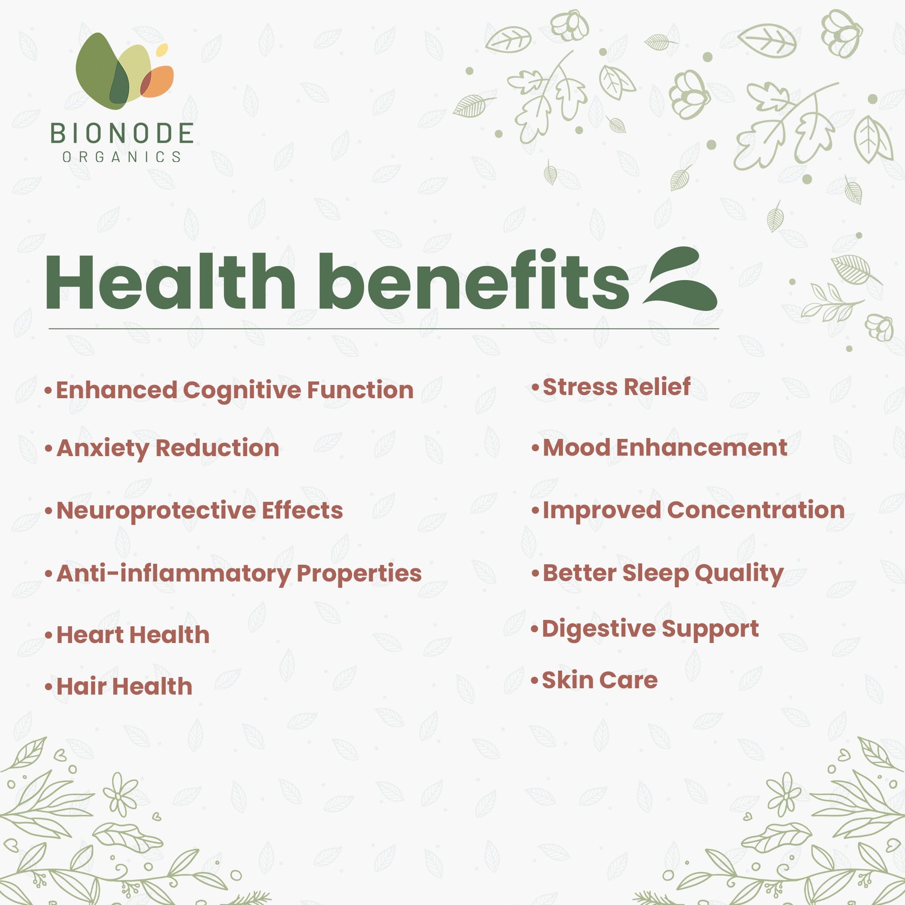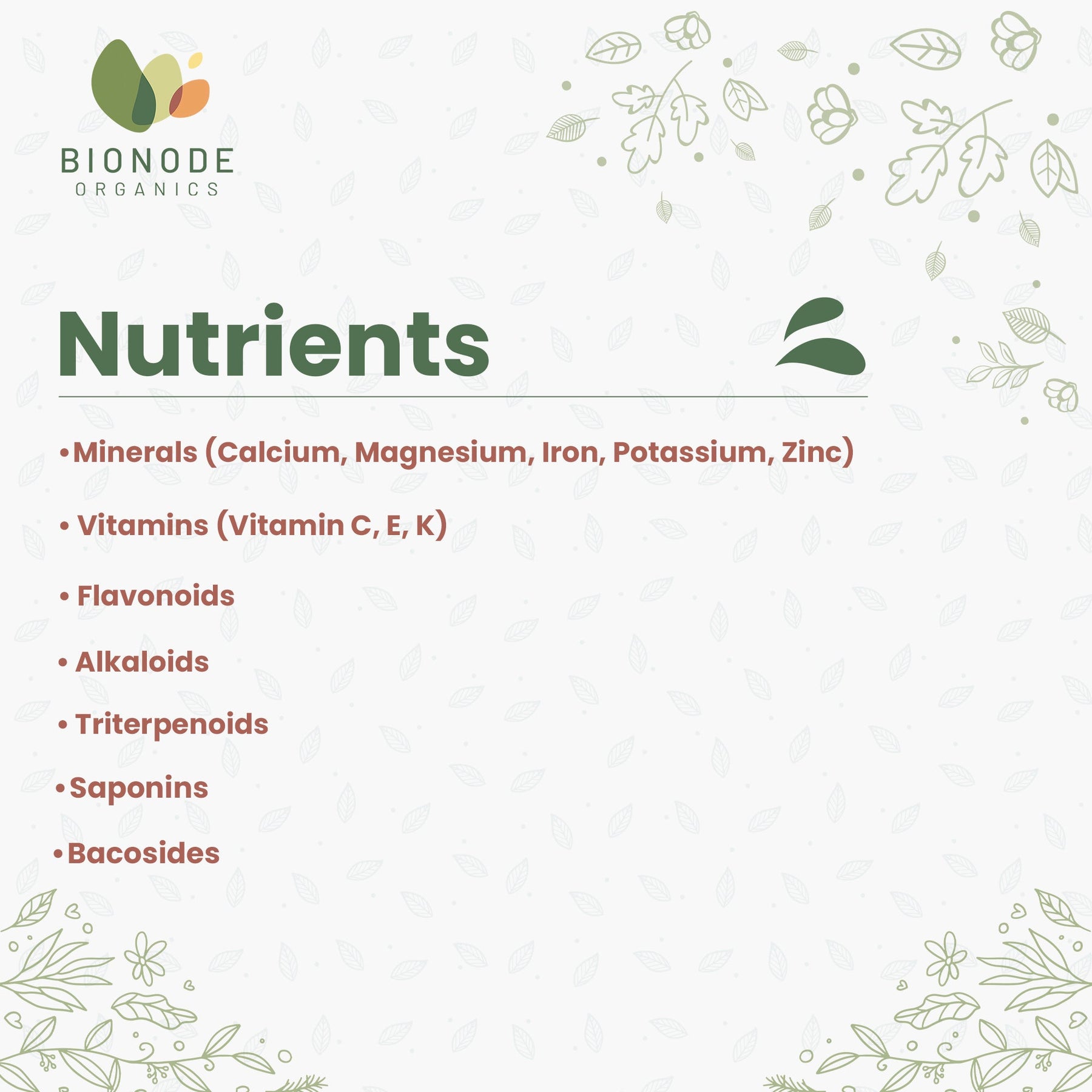 Introducing Bionode Organics’ certified organic Brahmi Powder, carefully sourced from the leaves of the Bacopa monnieri plant, revered in Ayurveda for its profound healing properties. Brahmi, known as “the herb of grace,” holds significant importance in traditional Ayurvedic medicine for its ability to enhance cognitive function, promote mental clarity, and support overall brain health. Bursting with benefits, Brahmi Powder is a rich source of antioxidants, flavonoids, and saponins, along with essential nutrients like vitamins (such as vitamin C and vitamin E), minerals (including calcium, magnesium, and iron), and fatty acids. Its therapeutic effects encompass stress relief, anxiety reduction, memory enhancement, and improved concentration. Certified organic and free from synthetic substances, our Brahmi Powder embodies the purity and potency of nature. Embrace mental clarity and holistic well-being naturally with Bionode Organics’ premium Brahmi Powder, your ultimate companion for cognitive vitality and rejuvenation.