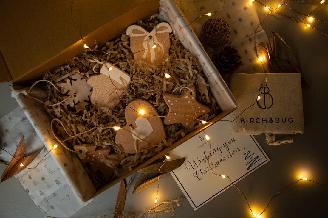 Our Birch Ornaments set feature 6 beautifully handcrafted ornaments in solid beechwood. A snowflake ornament, Santa’s glove, A Snow capped Christmas tree, A star, A heart & a gift box. These cute little treasures in a box will make the perfect holiday gift for friends and loved ones!
