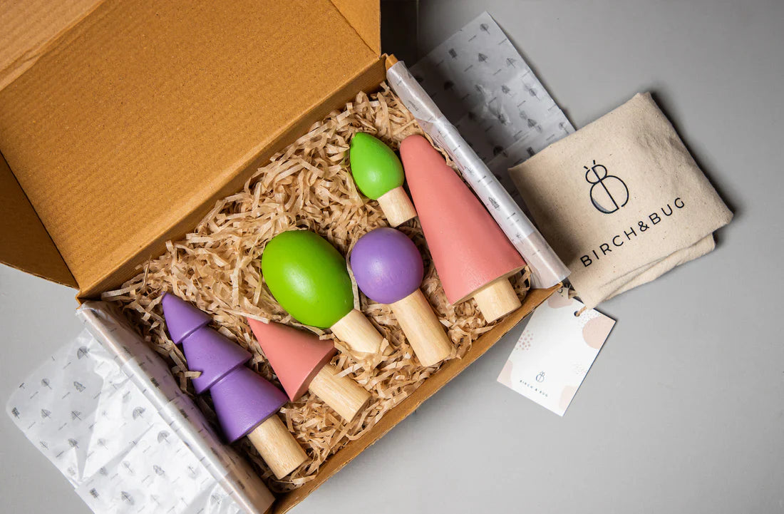 Our Spring trees come in a set of 6. Tallest tree measures 14 cms and smallest tree measures 7 cms. Birch & Bug Tree sets are made from ivory wood and finished with non toxic paints and finishes.