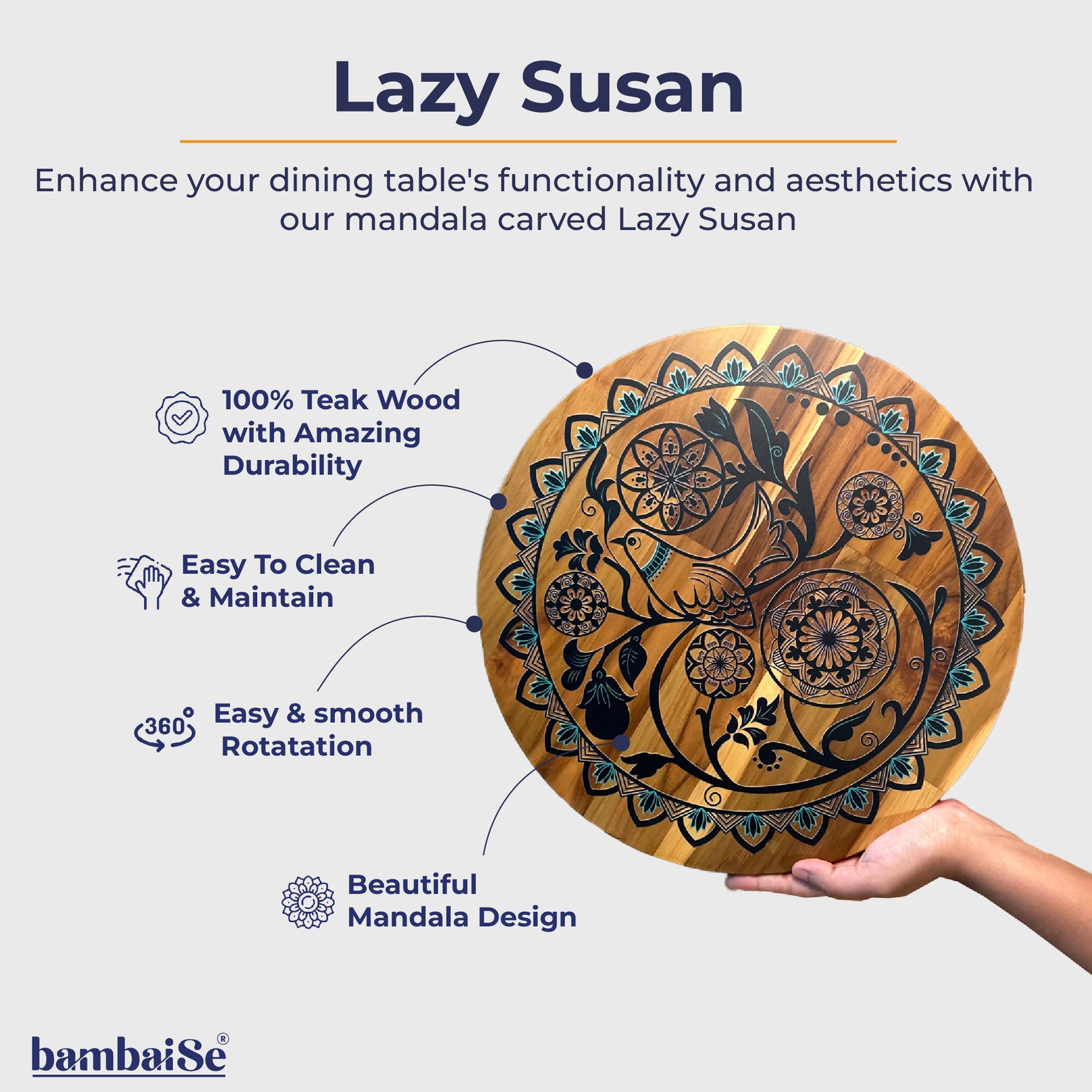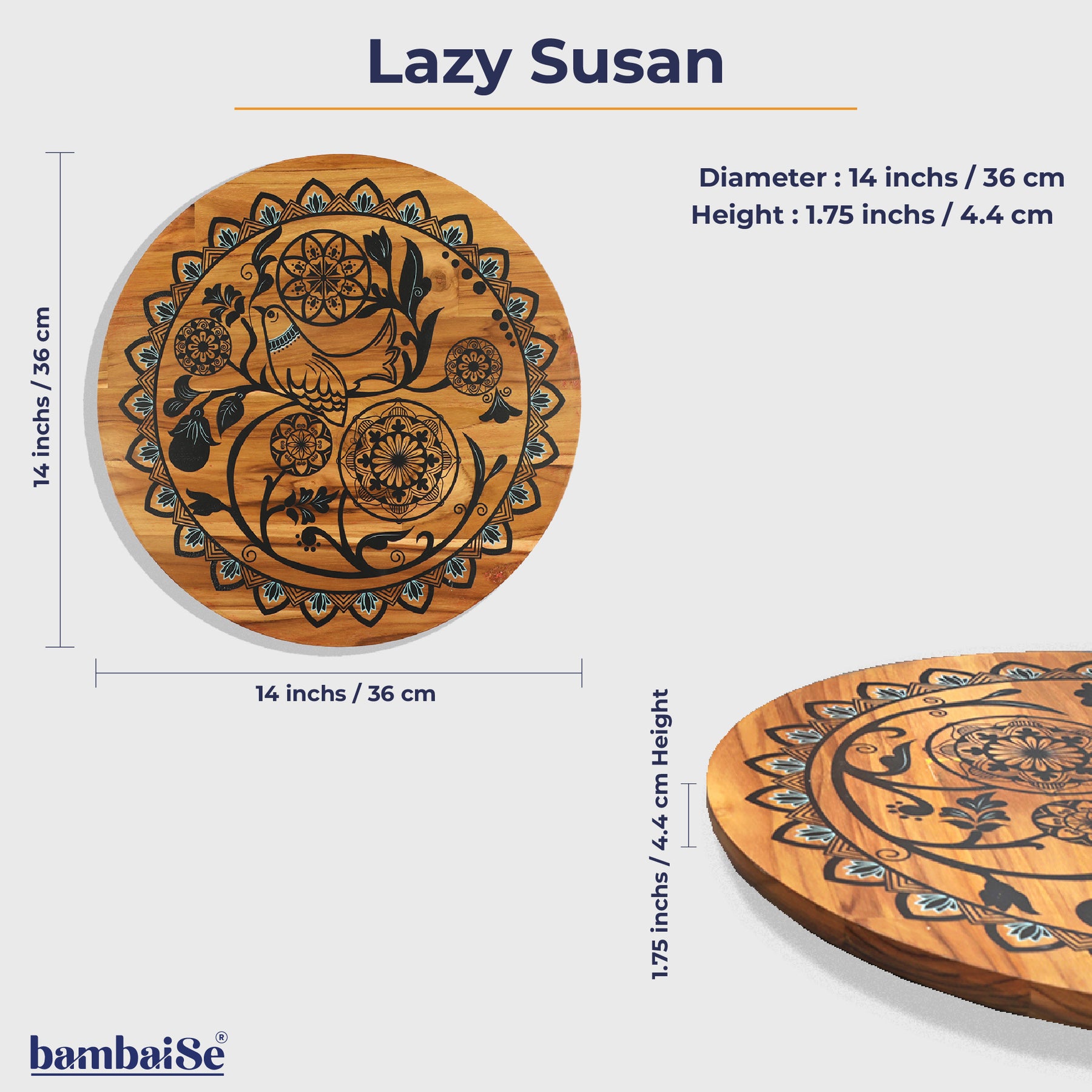 This Bird on a Mandala Lazy Susan is both beautiful and practical. The ribbed surface adds texture and the rotating mechanism makes it easy to access food. It's a great investment for any home. Bring your bites closer together or pass them over with a spin with our Lazy Susan which has an amazing design of Bird Mandala.