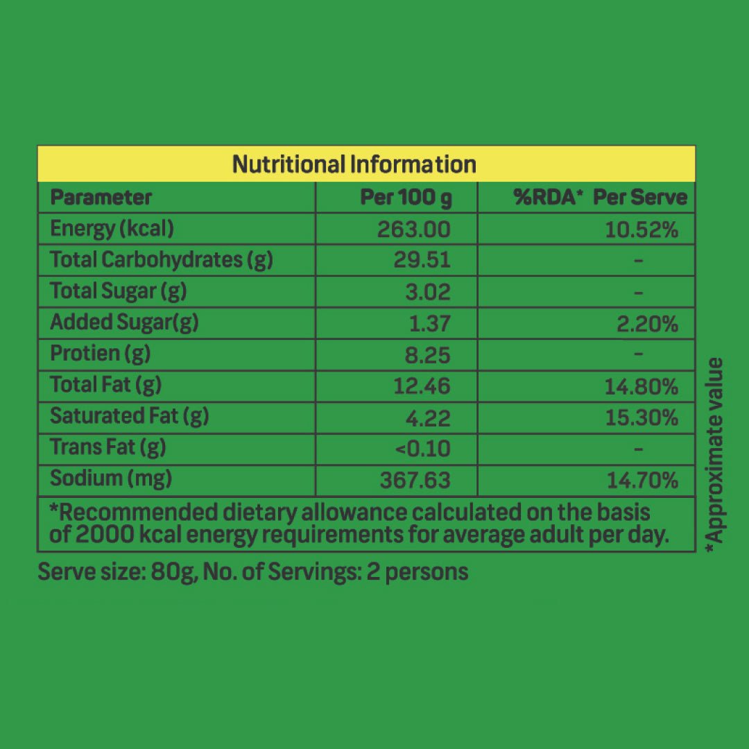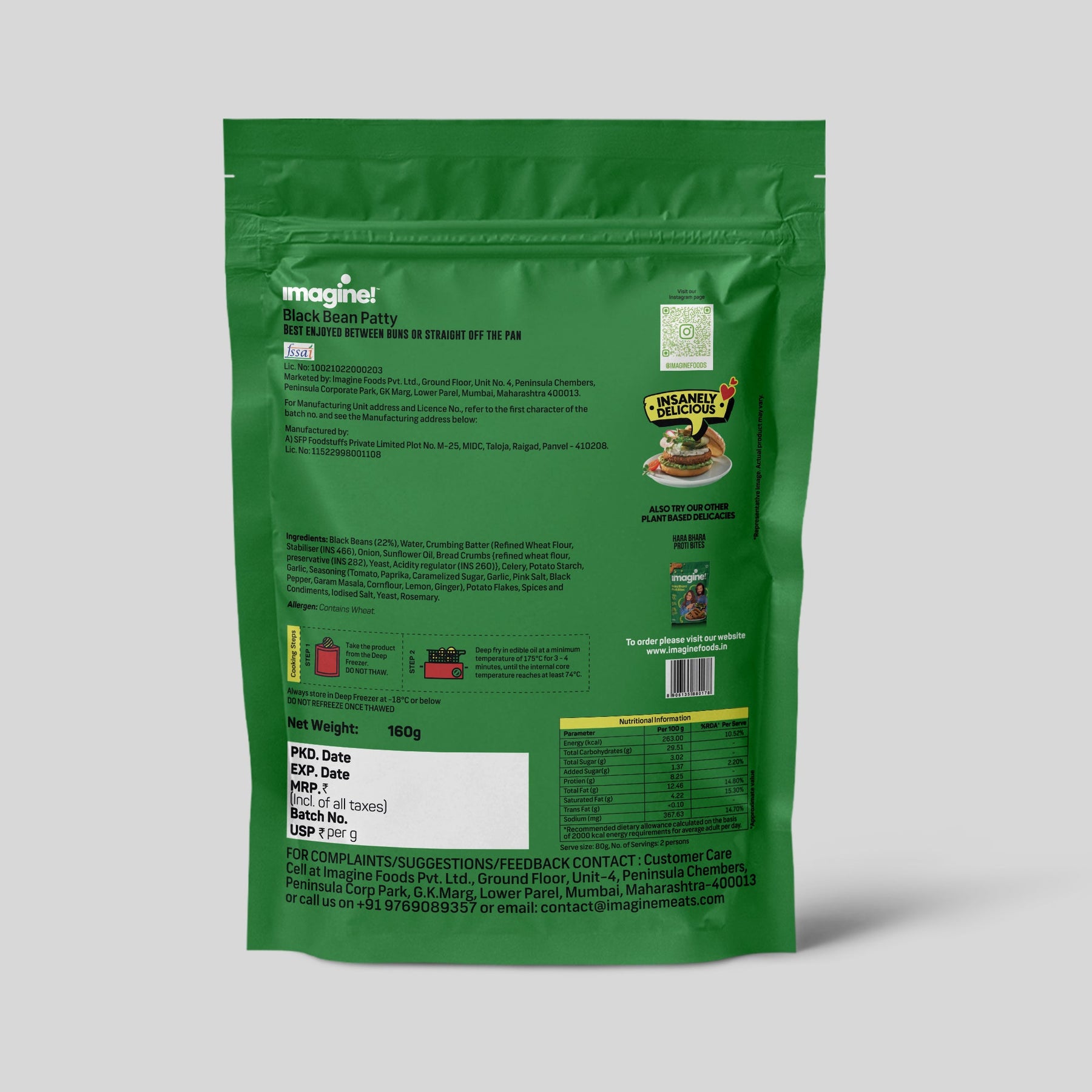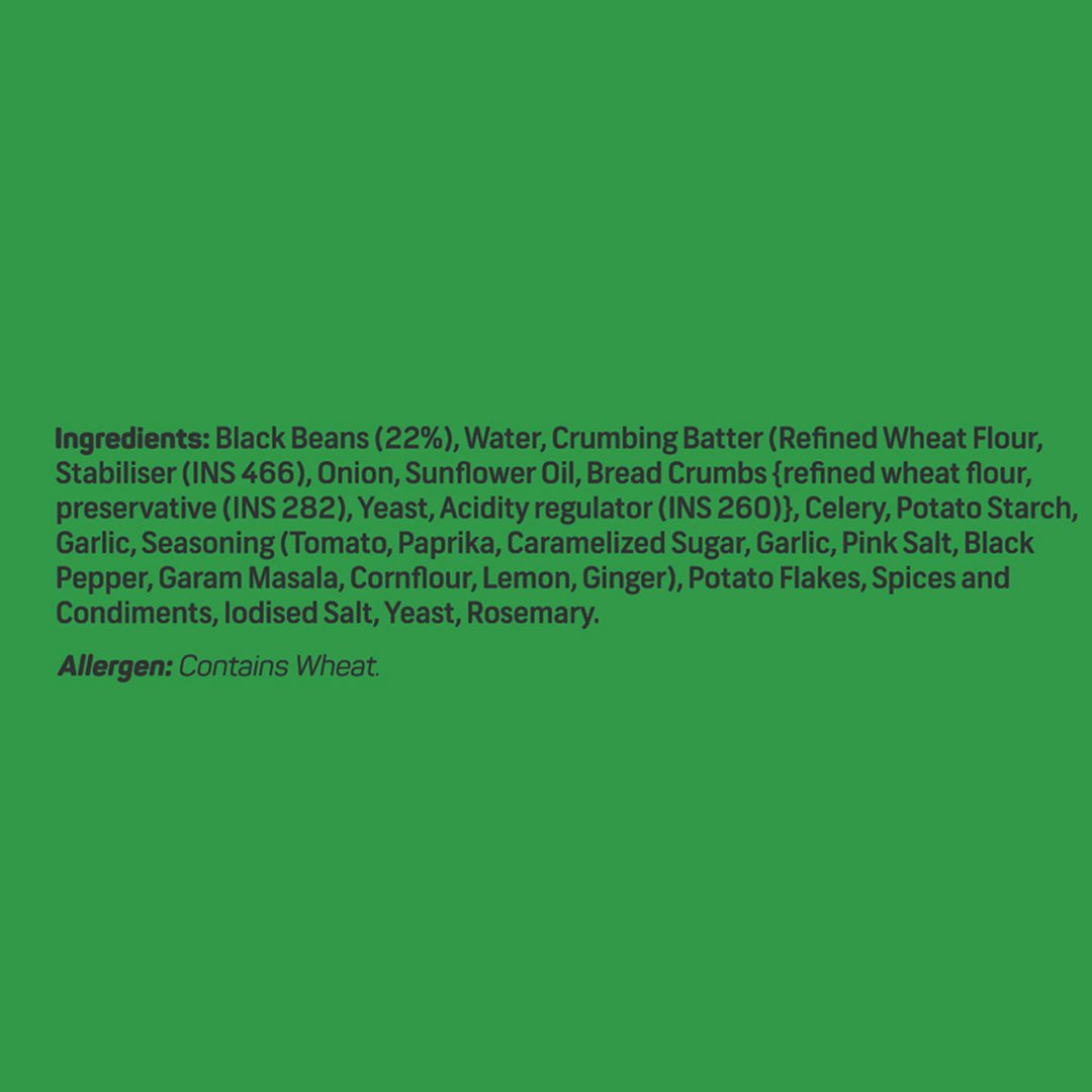 Ingredients: Black Beans (22%), Water, Crumbing Batter (Refined Wheat Flour, Stabiliser INS466), Onion, Sunflower Oil, Bread Crumbs (refined wheat flour, preservative INS282, Yeast, Acidity regulator INS260), Celery, Potato Starch, Garlic, Seasoning (Tomato, Paprika, Caramelized Sugar, Garlic, Pink Salt, Black Pepper, Garam Masala, Cornflour, Lemon, Ginger), Potato Flakes, Spices and condiments, Iodised Salt, Yeast, Rosemary.