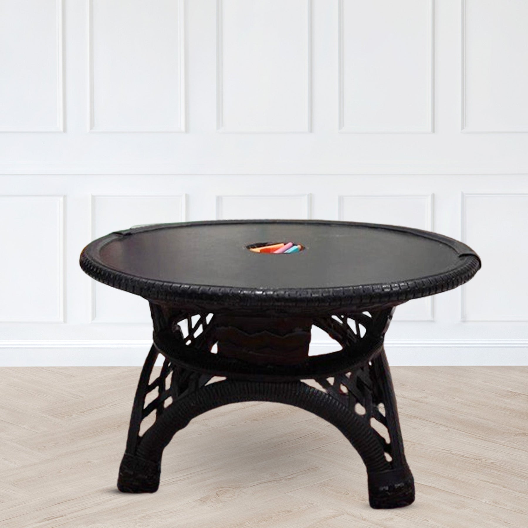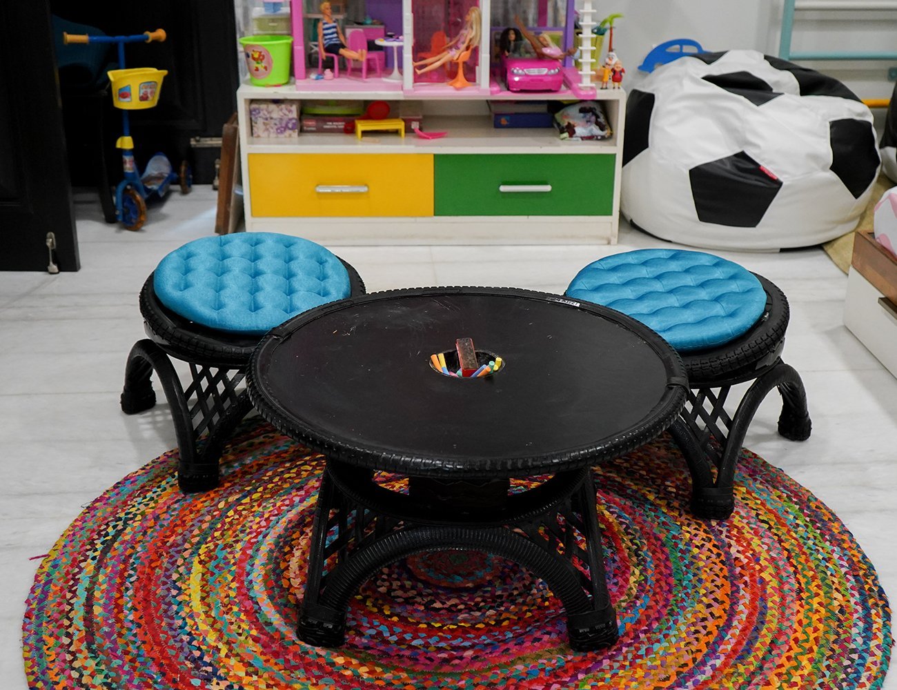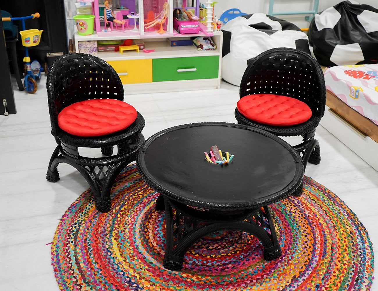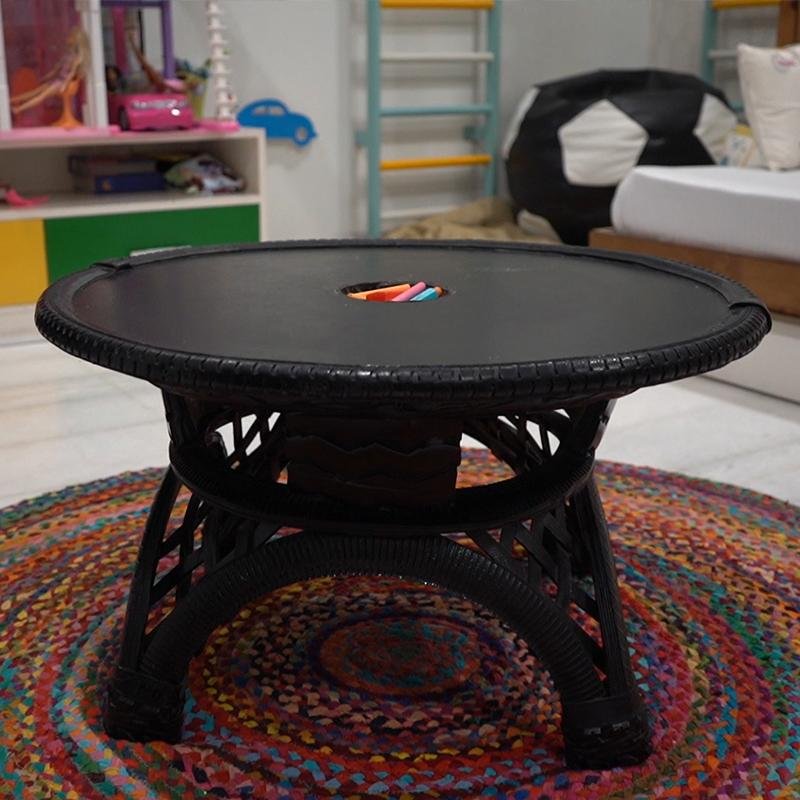 A cup has been provided in the center of the table in order to be able hold chalk colours and dusters