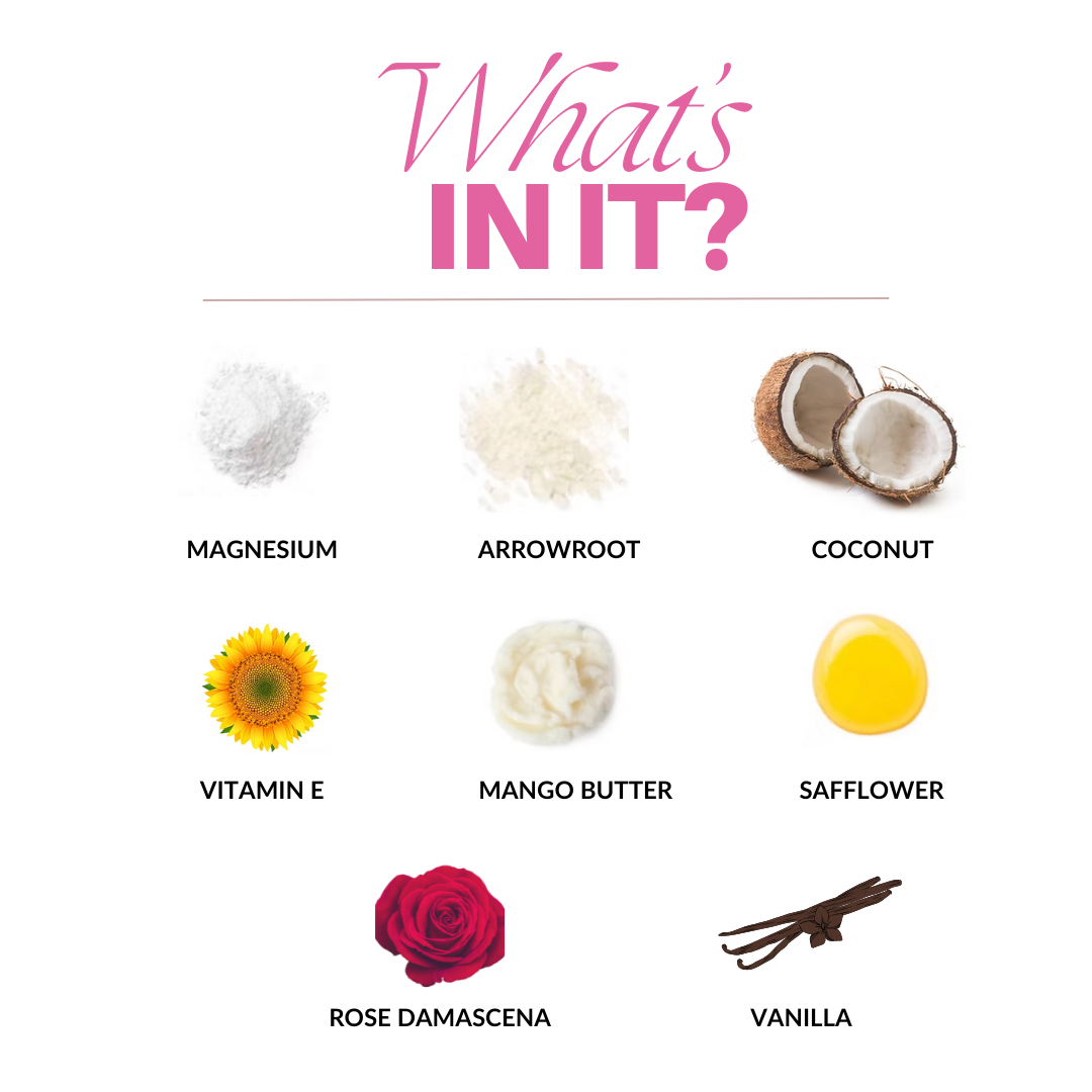 Magnesium Hydroxide, Coconut Oil*, Arrowroot Powder*, Candelilla Wax, Fractionated Coconut Oil*, Mango Butter*, Safflower Oil*, Zinc Ricinoleate (derived from Castor Oil), Sunflower Derived Vitamin E*, Vegan Probiotics* (Lactobacillus Acidophilus), Proprietary Essential Oils* blend of Rose Damascena & Vanilla absolute. *Organic ingredients