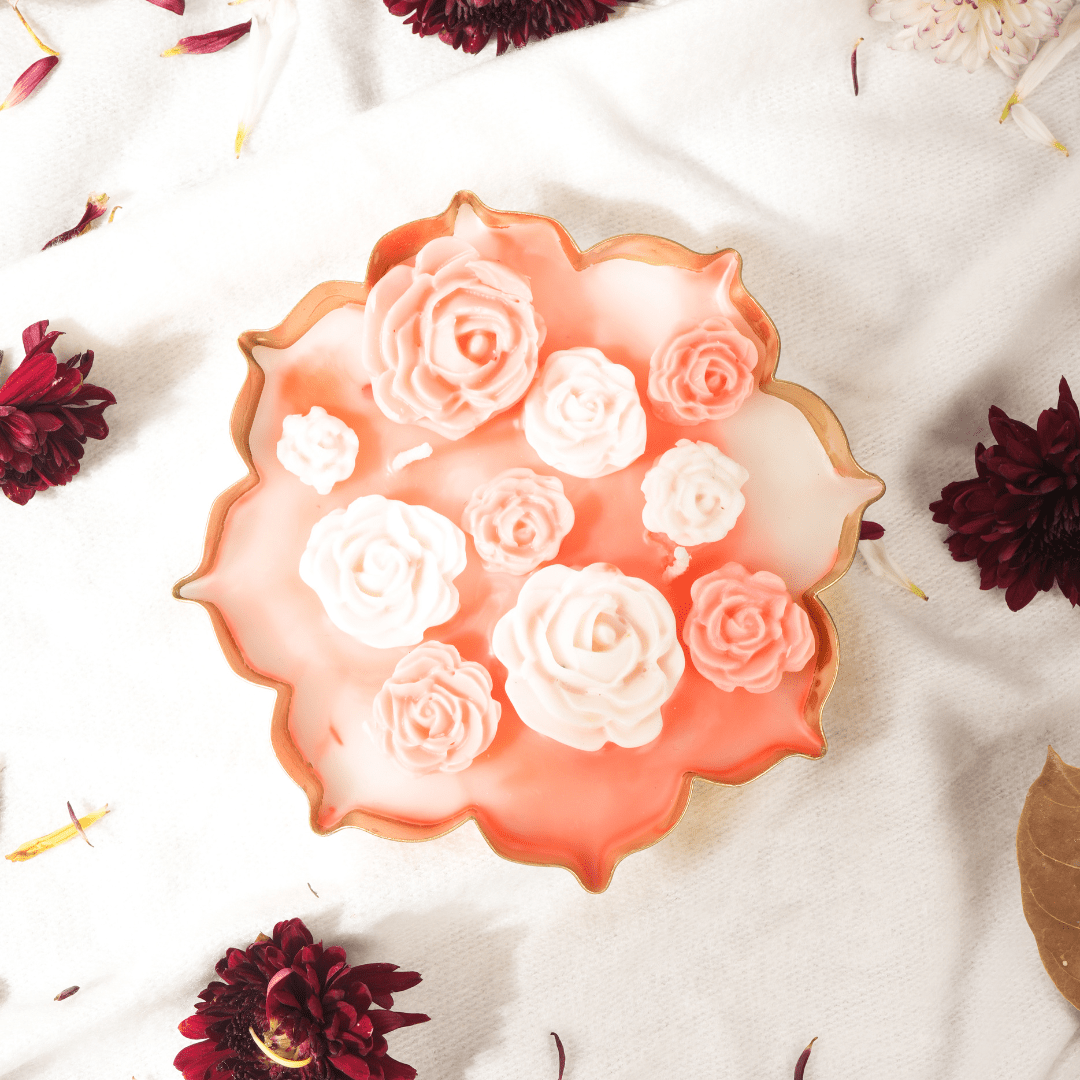 • Rose Metal Urli Candle: Hand-poured soy wax candle with rose detailing, ideal for festive décor.