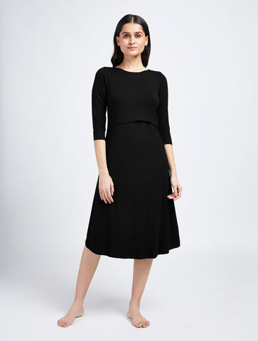 Discover comfort and style with our postpartum-friendly nursing bamboo maternity dress, designed with new moms in mind. This elegant dress features a flattering boat neck and long sleeves, perfect for cooler weather or layering. The top-stitching detail at the front bodice adds a touch of sophistication, while the lift-up nursing access ensures easy and discreet breastfeeding. Crafted from soft, sustainable bamboo fabric, this dress is breathable and gentle on sensitive skin, providing the ultimate comfort. The midi silhouette flatters your figure, offering a versatile look that can be dressed up or down for any occasion. Embrace motherhood with ease and elegance in this thoughtfully designed nursing dress