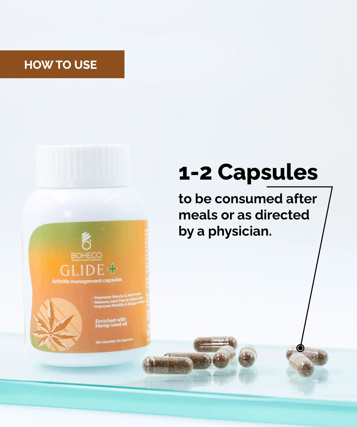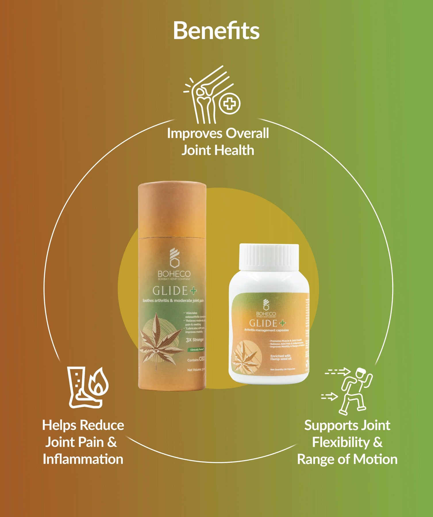 Ideal for individuals seeking a natural and effective approach to joint care, GLIDE+ supports the body both internally and externally, offering complete arthritis management through its capsule, oil, and combo formats.