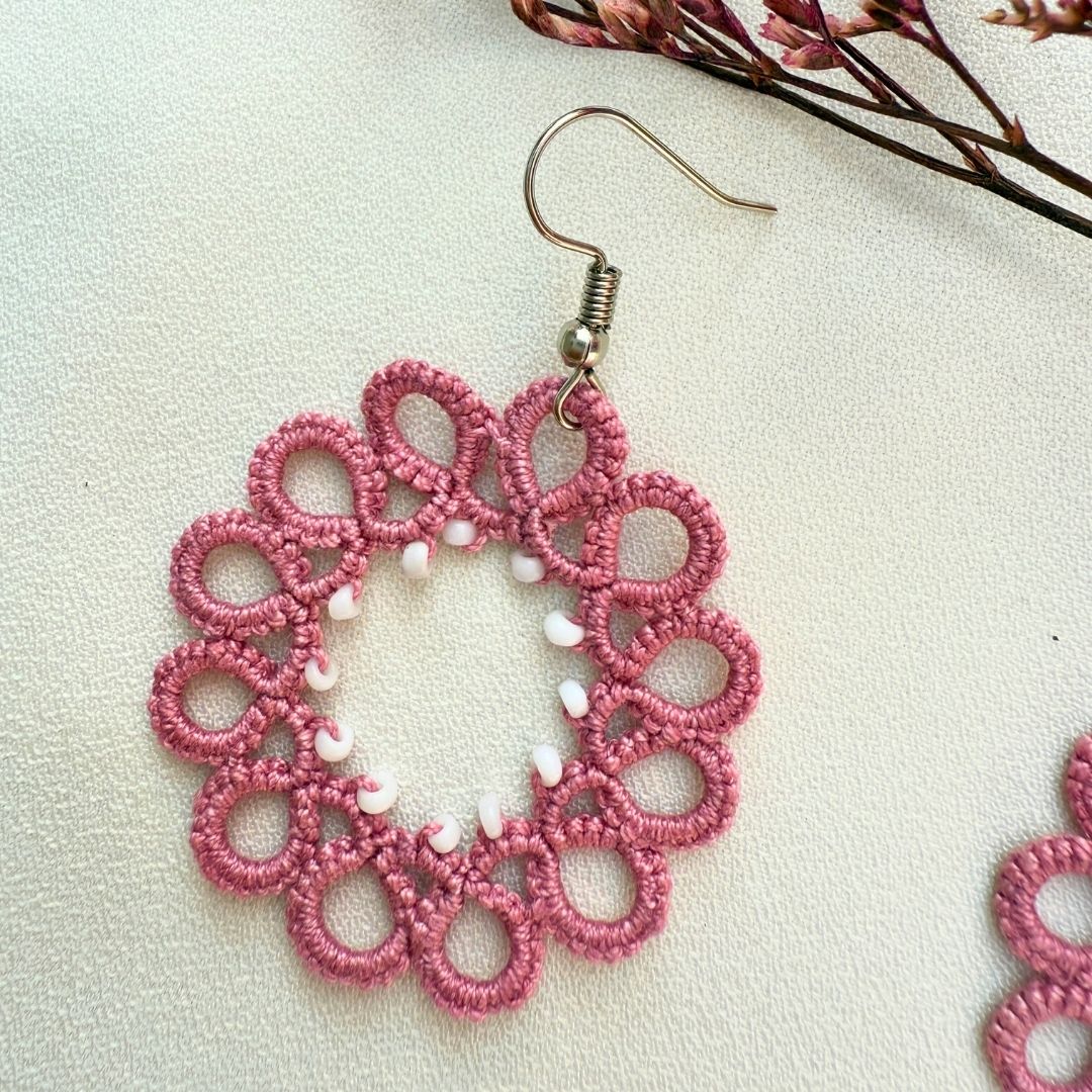 Beautifully crafted with cotton thread and delicate beads using the age-old technique of tatting, these earrings feature intricate lacework created knot by knot with shuttle tatting. Handmade with great care, each pair is exclusively crafted using this traditional method. These super cool, extremely lightweight earrings are versatile enough to complement any attire, ensuring you can wear them all day with ease. As artisanal items entirely made and decorated by hand, small imperfections denote the originality of the product. So, hop on board and add a touch of artisanal charm to your ensemble! Dimenions: L 4 x W 3.8 cm (approx) Please note: Delivery takes 7-10 days in some cases.