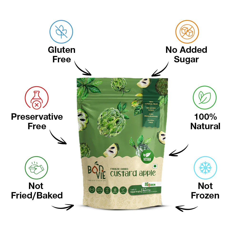 Bonvie freeze dried custard apple is a delicious and satisfying snack, perfect for on-the-go, as a pre-workout snack, or as a healthy dessert.