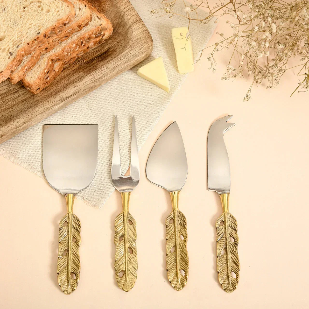 Presenting Punkh, a set of four cheeses and serving knives that seamlessly blend refined design with culinary functionality. Each knife features a lead-free brass feather handle, delicately crafted to perfection, paired with a sleek stainless steel body.