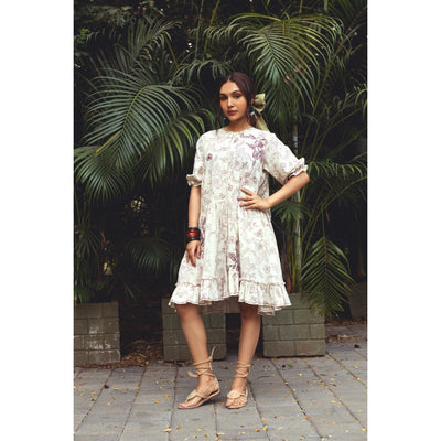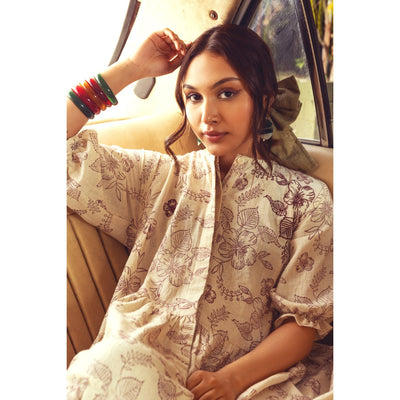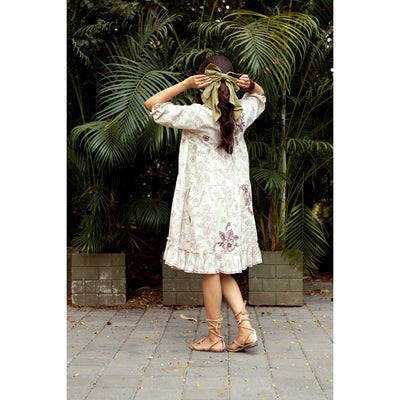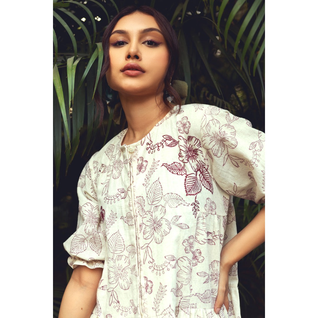 Flowy dress, designed with a front opening for ease of wear. Adorned with a charming hibiscus print throughout, this dress features exquisite embroidery detailing on select flowers, adding an extra touch of elegance to its delightful design.