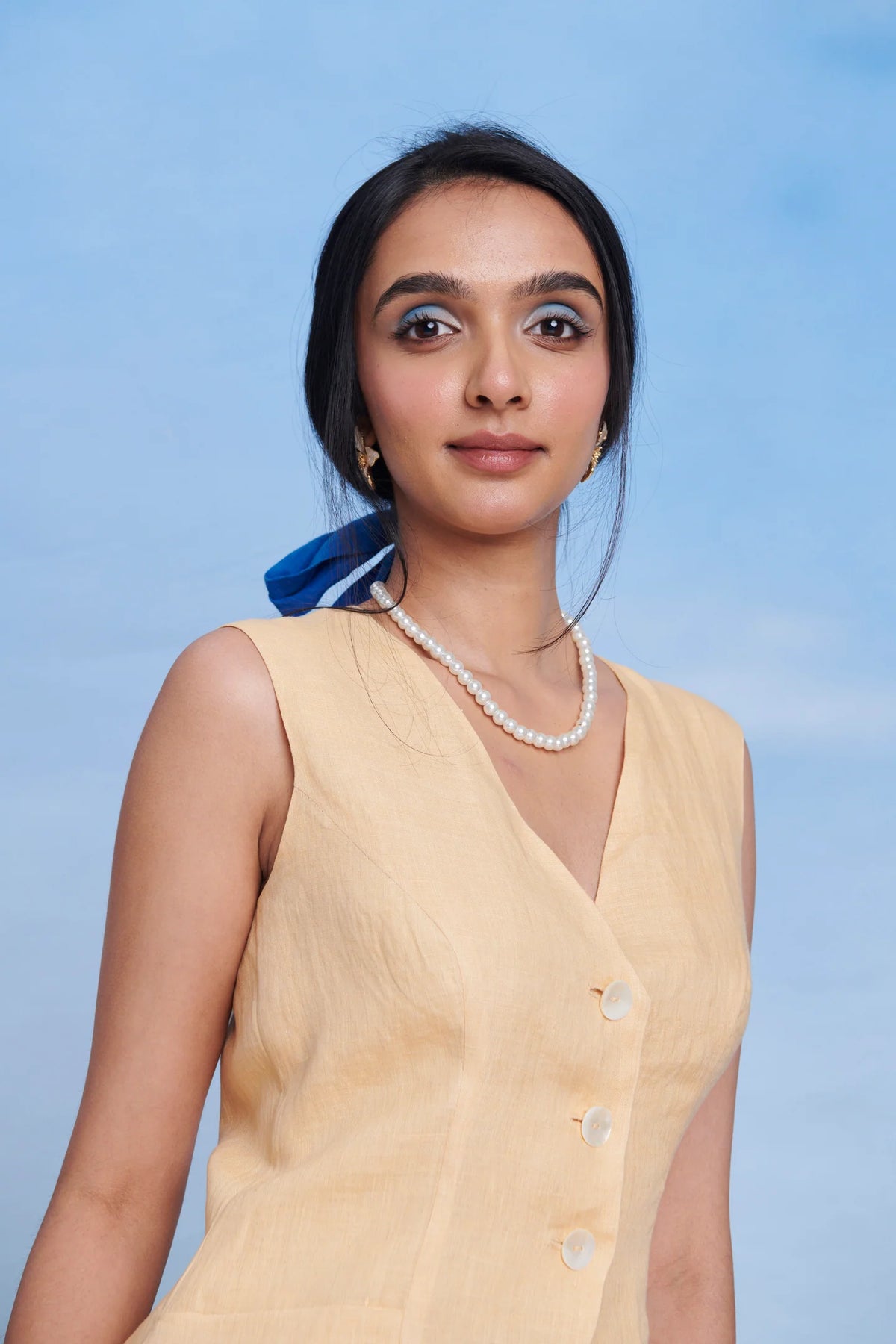 A warm-weather set that balances structure with softness. The sleeveless V-neck vest is tailored in 100% pure linen with princess seams, a gently flared hem, and side ties for a custom fit. It pairs effortlessly with the ankle-grazing maxi skirt, designed with a wide waistband and soft pleating for graceful movement. Lightweight, breathable, and versatile — this set transitions with ease from everyday moments to elevated occasions.