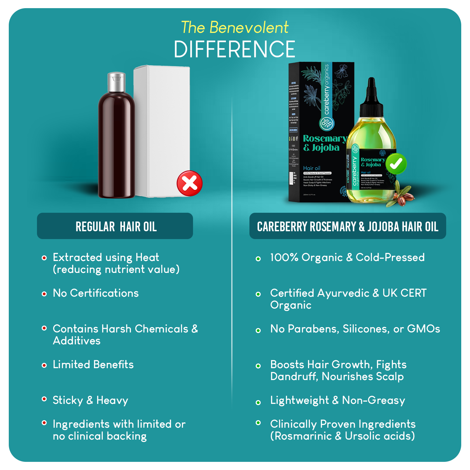 Careberry 100% Organic Rosemary & Jojoba Anti Dandruff Hair Oil, 100% Natural & Cold Pressed, Ayush Certified Ayurvedic 200ml