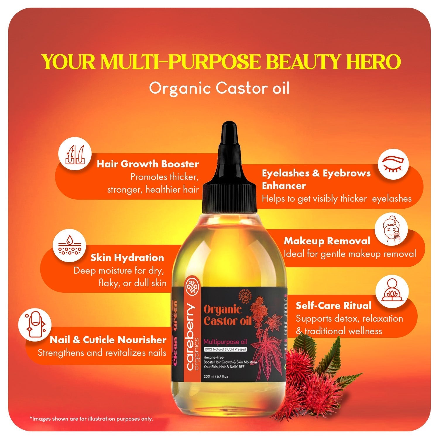 Explore Careberry's 100% Organic Hexane-free Castor Oil, Organic Certified cold-pressed oil crafted to amplify hair growth and alleviate dry scalp. It serves as a natural remedy for adding volume to your hair, repairing hair damage, and addressing dandruff concerns, resulting in glossy, voluminous, and resilient curls. Introducing: Careberry's Organic, Hexane-Free Castor Oil. Elevate Your Locks: Dreaming of fuller, thicker, and rapidly growing locks? Our premium Castor Oil is the solution. Bid farewell to hair loss and embrace your luxurious mane. Keep It Luxurious: Beyond hair care, it's the ultimate solution for dry, brittle hair, flaky scalps, and dandruff issues. Multitask like a Pro: It's not just for hair. Say hello to Skin Moisturizer, Nail Growth Serum, and Eyebrow Growth Serum – all in one bottle. Glow Getter: More than a facial moisturizer – it's a hydration booster, a healer, and a glow enhancer. Pamper Yourself: Envision radiant skin from head to toe when used as a body moisturizer. Versatile Mixer: Need a carrier for your favorite essential oils? Castor Oil is the perfect companion. Hexane-Free Assurance: We prioritize your well-being with clean, Hexane-Free beauty products. Inclusive Beauty: Suitable for all skin types, hair textures, and nail conditions – you're part of our diverse family. Always with Careberry: "Live Clean, Glow Green"!