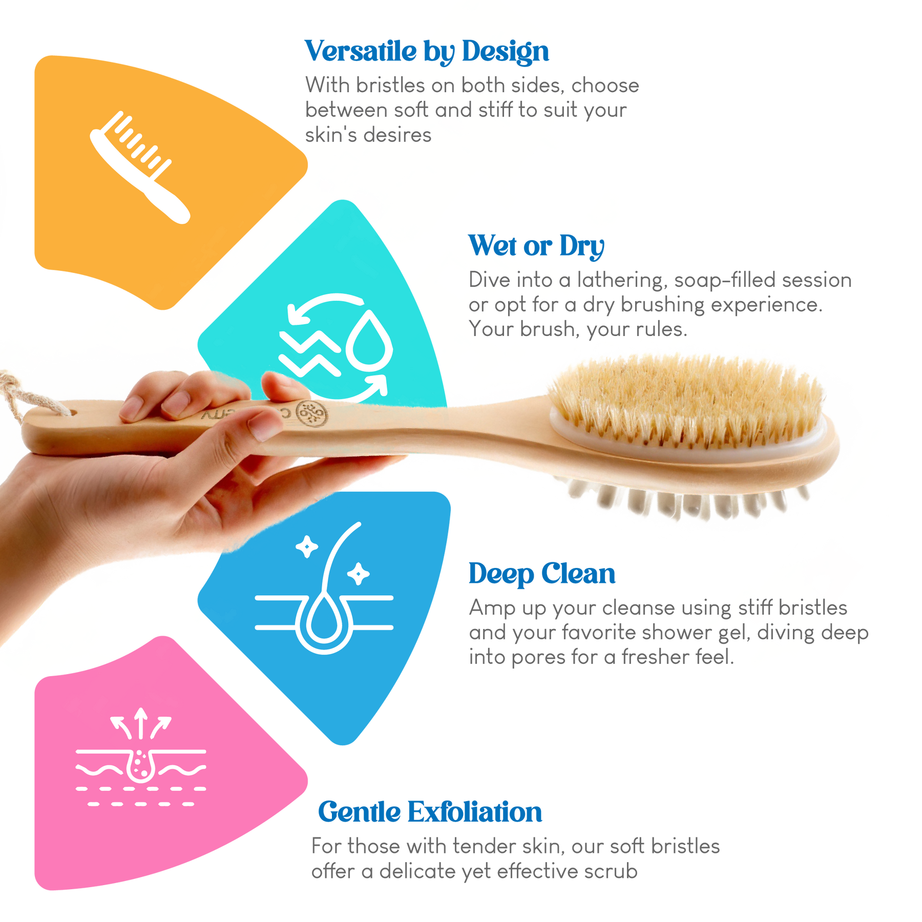 Versatile by Design: With bristles on both sides, choose between soft and stiff to suit your skin's desires. Whether you're craving a gentle touch or a deep scrub, we've got you. Wet or Dry: Dive into a lathering, soap-filled session or opt for a dry brushing experience. Your brush, your rules. Deep Clean: Amp up your cleanse using stiff bristles and your favorite shower gel, diving deep into pores for a fresher feel. Gentle Exfoliation: For those with tender skin, our soft bristles offer a delicate yet effective scrub, especially when paired with a soothing bath liquid. Dry Brushing Benefits: Boost blood circulation and tackle cellulite by harnessing the power of our brush's dry massage capability. For All: Whether you're a man or woman, sensitive or tough-skinned, this is the brush that backs you up in the shower.