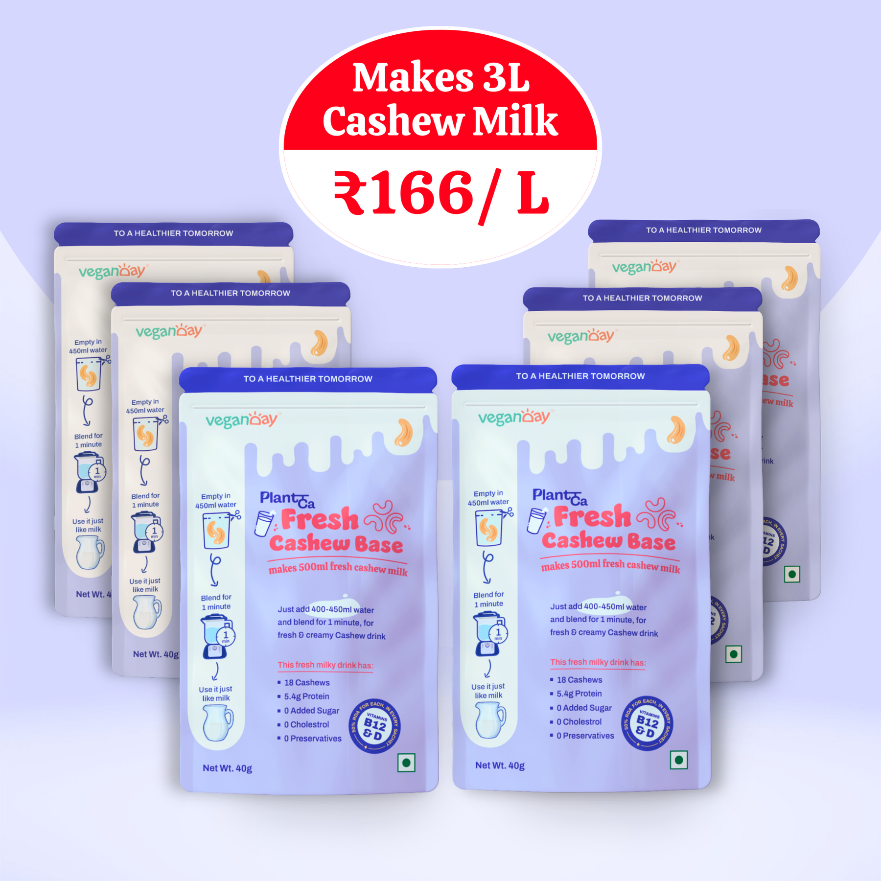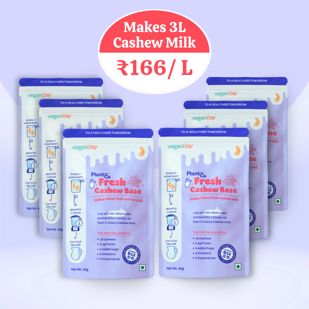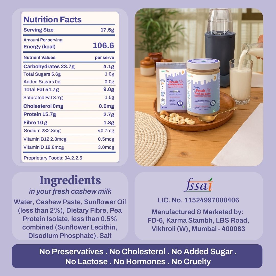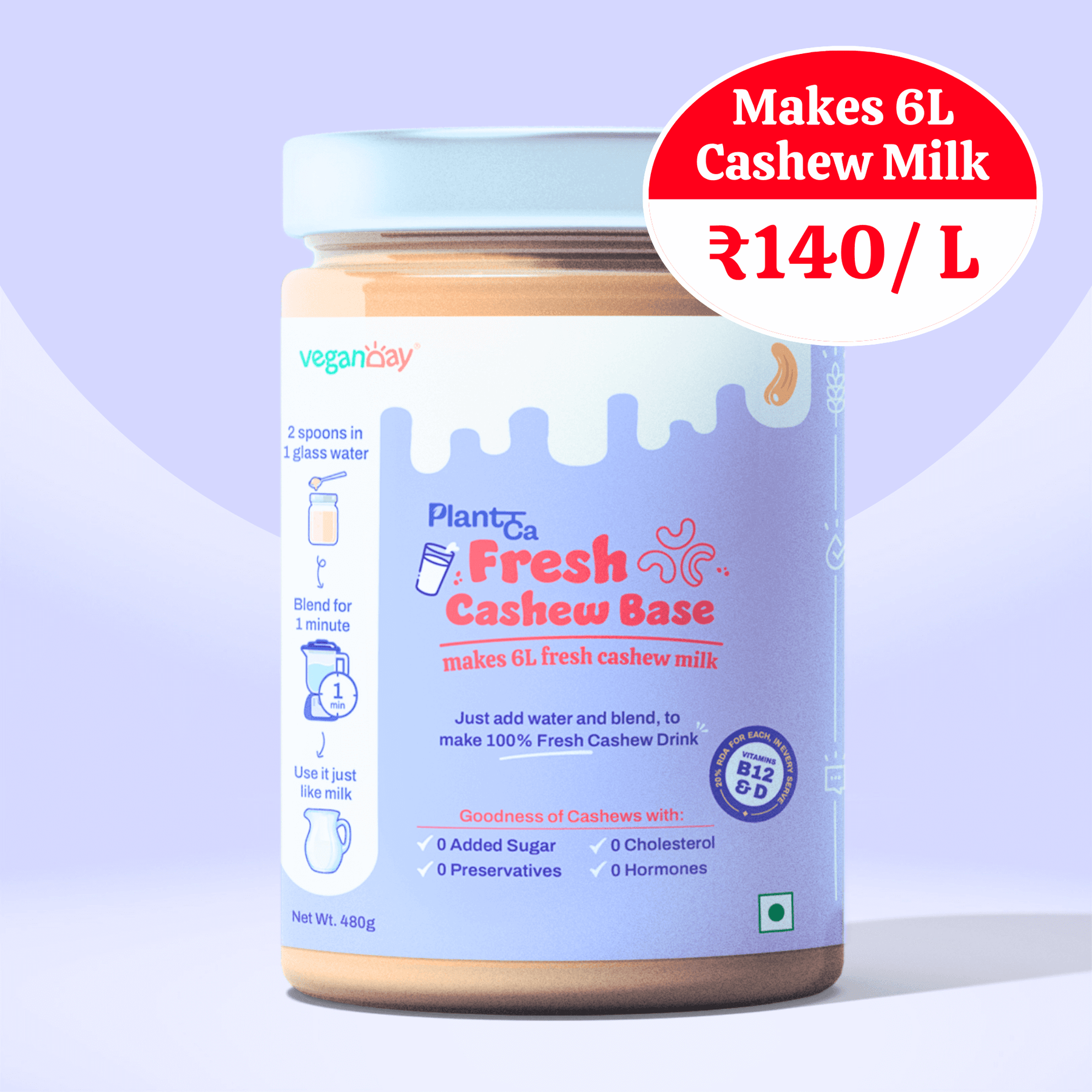 HOW TO PREPARE - Just add the cashew-milk base to water and blend for a minute. Ensure you use a mixer-grinder or a hand-blender and blend it for 60 seconds. When using pouches, use 400-500ml for the whole pouch and when using jars, take a glass of water (200ml) for 2 spoons of cashew milk paste.