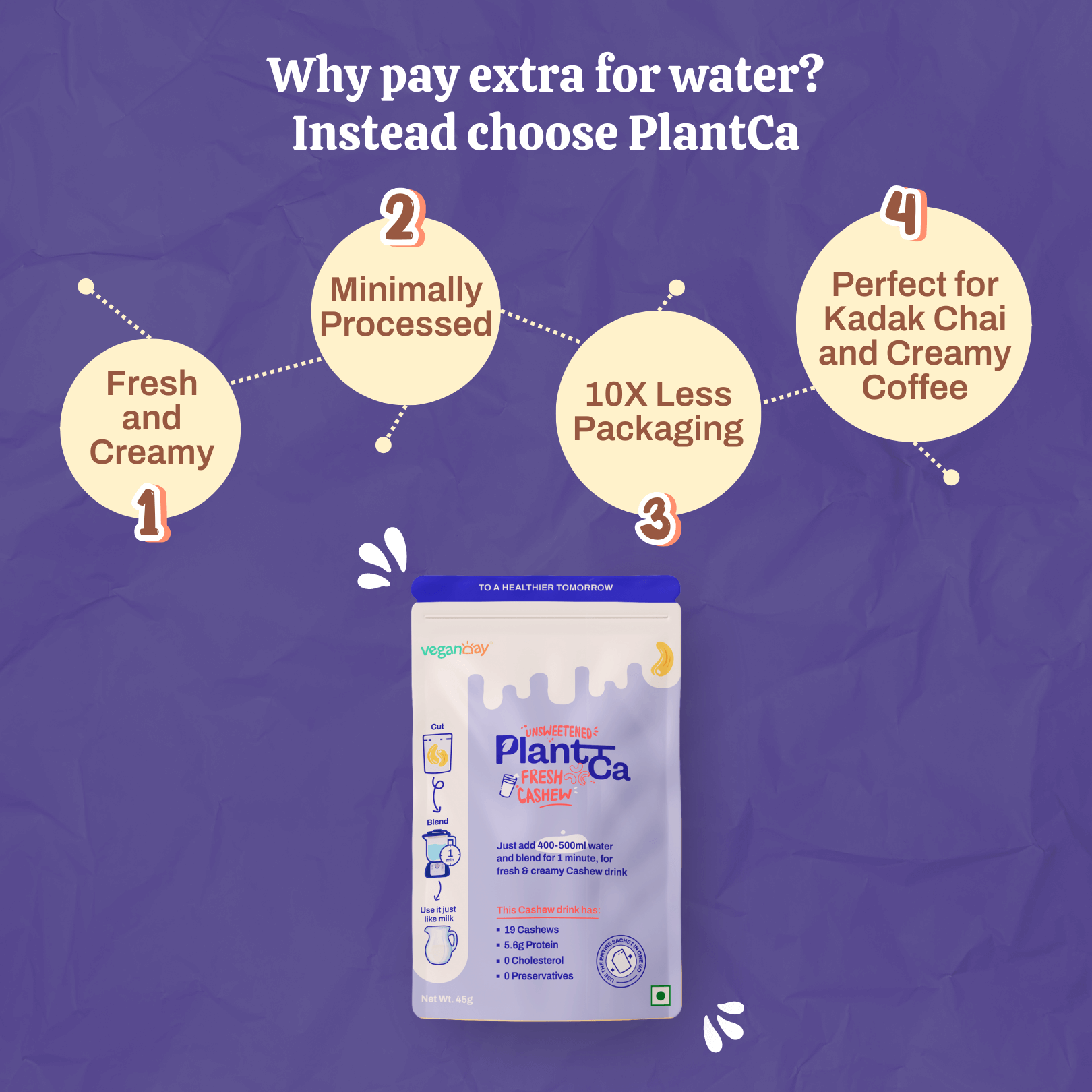 WHY PAY EXTRA FOR WATER? Tetrapaks have 90%+ water, which leads to increase in shipping costs. Why not make fresh plant-milk at home, by just adding water and blending? Oh, and you can customize the thickness you want, by adjusting the quantity of water.