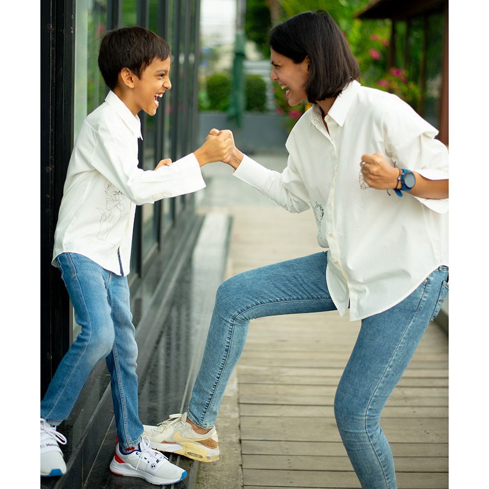 Crafted in soft, breathable organic cotton, this white shirt features playful Tom & Jerry embroidery äóî with Tom on one side and Jerry peeking from a mouse hole. Perfect for casual days, parties, or quirky twinning looks!