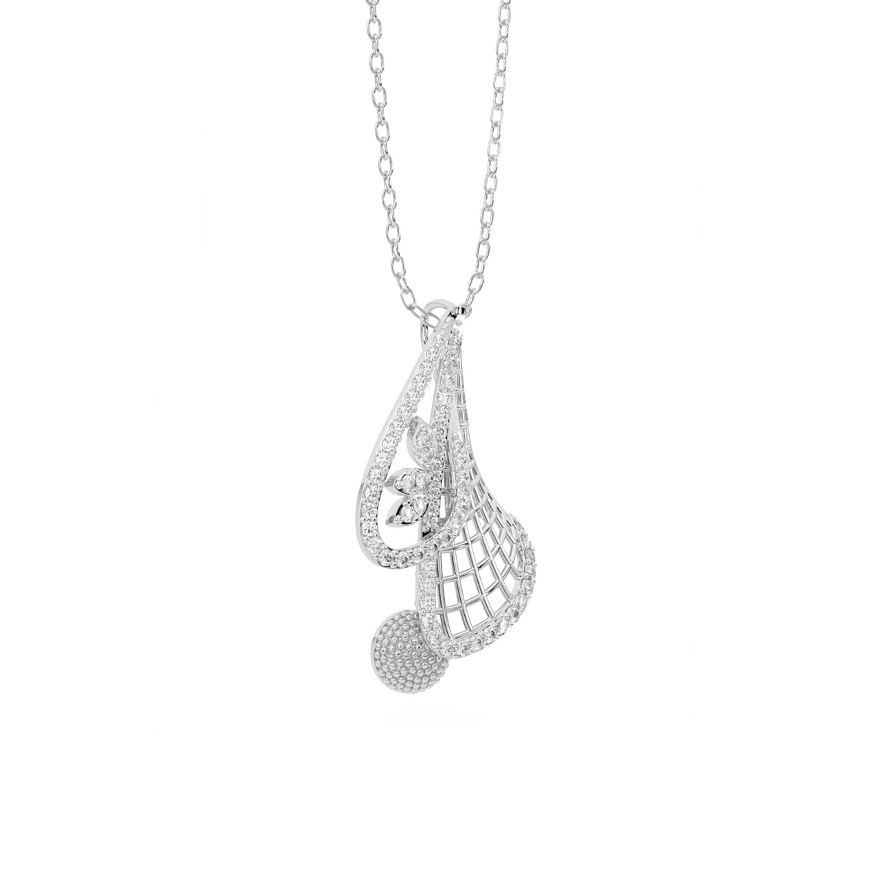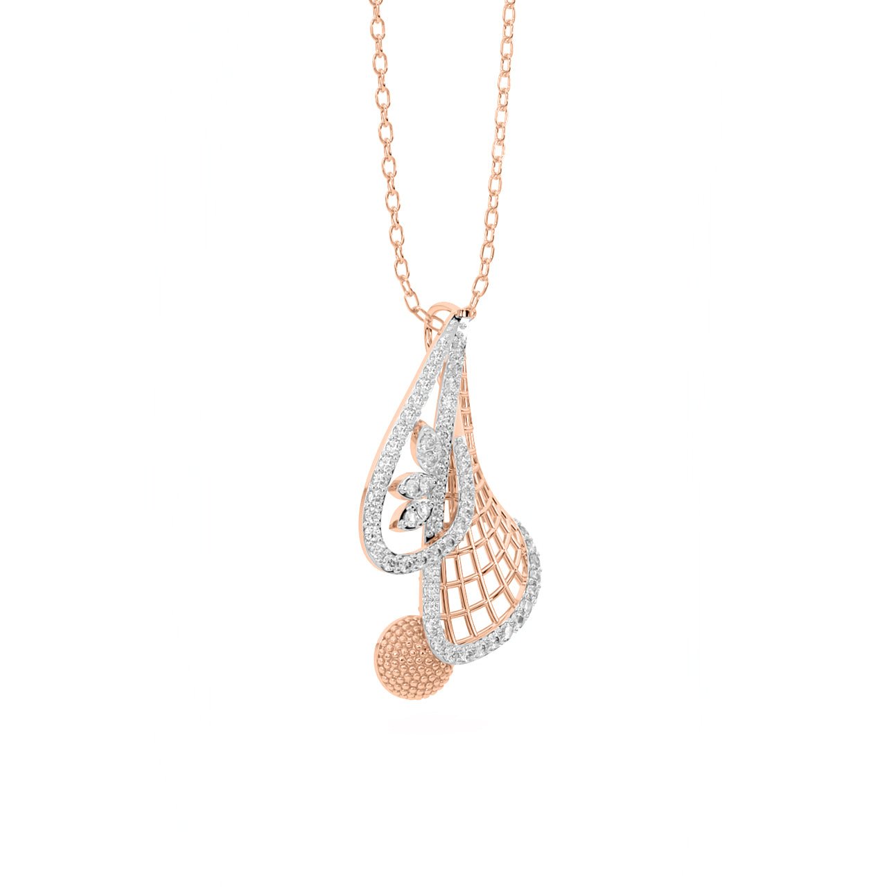 Inspired by celestial flow and delicate craftsmanship, the Celestia Filigree Pendant features a graceful lattice cone wrapped in a sparkling diamond curve. A petite floral motif sits within a teardrop silhouette, while a textured golden sphere adds a playful yet poised finish. This pendant is a true celebration of structure, shimmer, and feminine artistry.