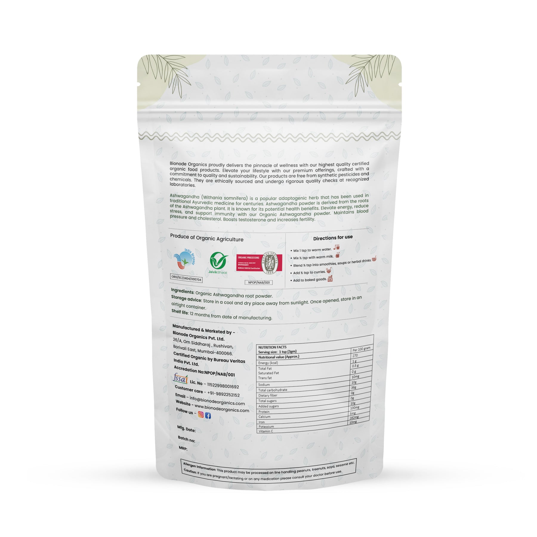 Bionode Organics proudly presents its certified organic Ashwagandha powder, sourced from the roots of the Withania somnifera plant cultivated in certified organic farms. This adaptogenic herb, deeply rooted in traditional Ayurvedic medicine, is renowned for its potential health benefits and is available in convenient powder form. Our commitment to organic practices ensures it’s free from synthetic pesticides, insecticides, and fertilizers. Enriched with bioactive compounds like withanolides, alkaloids, and steroidal lactones, this botanical supplement harnesses the adaptogenic and antioxidant properties of Ashwagandha. Not only is it a rich source of Vitamin C, but it also provides essential nutrients, including protein, calcium, iron, and fiber. Elevate your well-being naturally with Bionode Organics’ premium Ashwagandha powder.