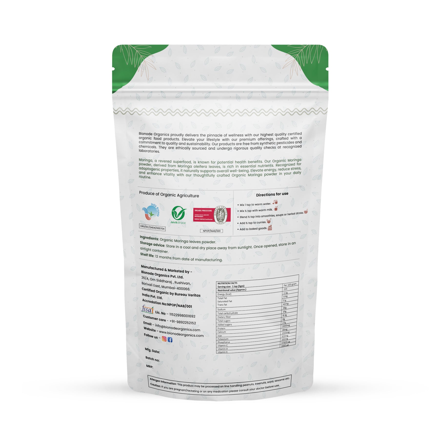 Introducing Bionode Organics’ certified organic Moringa powder, meticulously derived from the leaves of the Moringa oleifera tree cultivated in certified organic farms. Revered in Ayurveda for centuries, Moringa holds significant importance as a versatile herbal remedy and nutrient powerhouse. Bursting with benefits, Moringa powder is rich in vitamins (such as vitamin A, C, and E), minerals (including calcium, iron, and potassium), antioxidants, and essential amino acids. Its therapeutic effects encompass immune support, energy boost, blood sugar regulation, and overall vitality. Certified organic and free from synthetic substances, our Moringa powder embodies the purity and potency of nature. Embrace holistic well-being naturally with Bionode Organics’ premium Moringa powder, your ultimate source of vitality and rejuvenation.