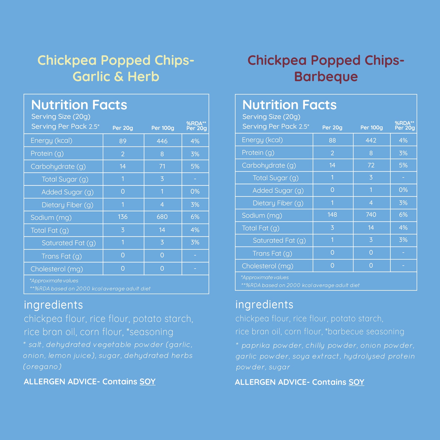 Two tantalizing flavours in one perfect pack. Enjoy both varieties of our power packed chickpea popped chips, tangy barbecue and zesty garlic & herb. This pack includes: