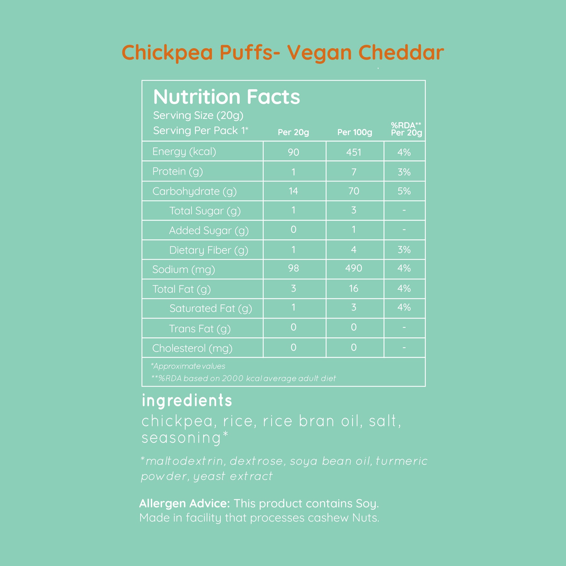Light and crunchy puffs made from wholesome chickpea. These high protein puffs are rich in flavour and crispy to the core. Get that fix of cheesy flavour you've been craving, and best of all - its vegan! (Bundle Pack of 3)