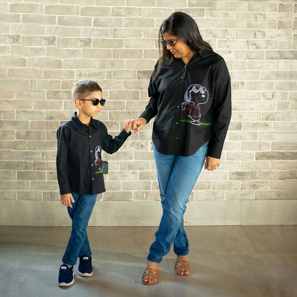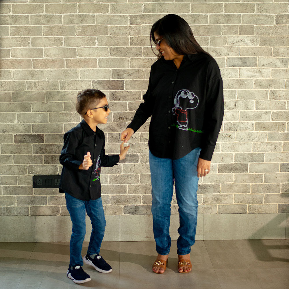Laid-back vibes only! This cool black shirt features a relaxed hand-embroidered Snoopy just doing his thing äóî chilling in style. Made with breathable organic cotton, itäó»s perfect for playdates, picnics, and everything in between.