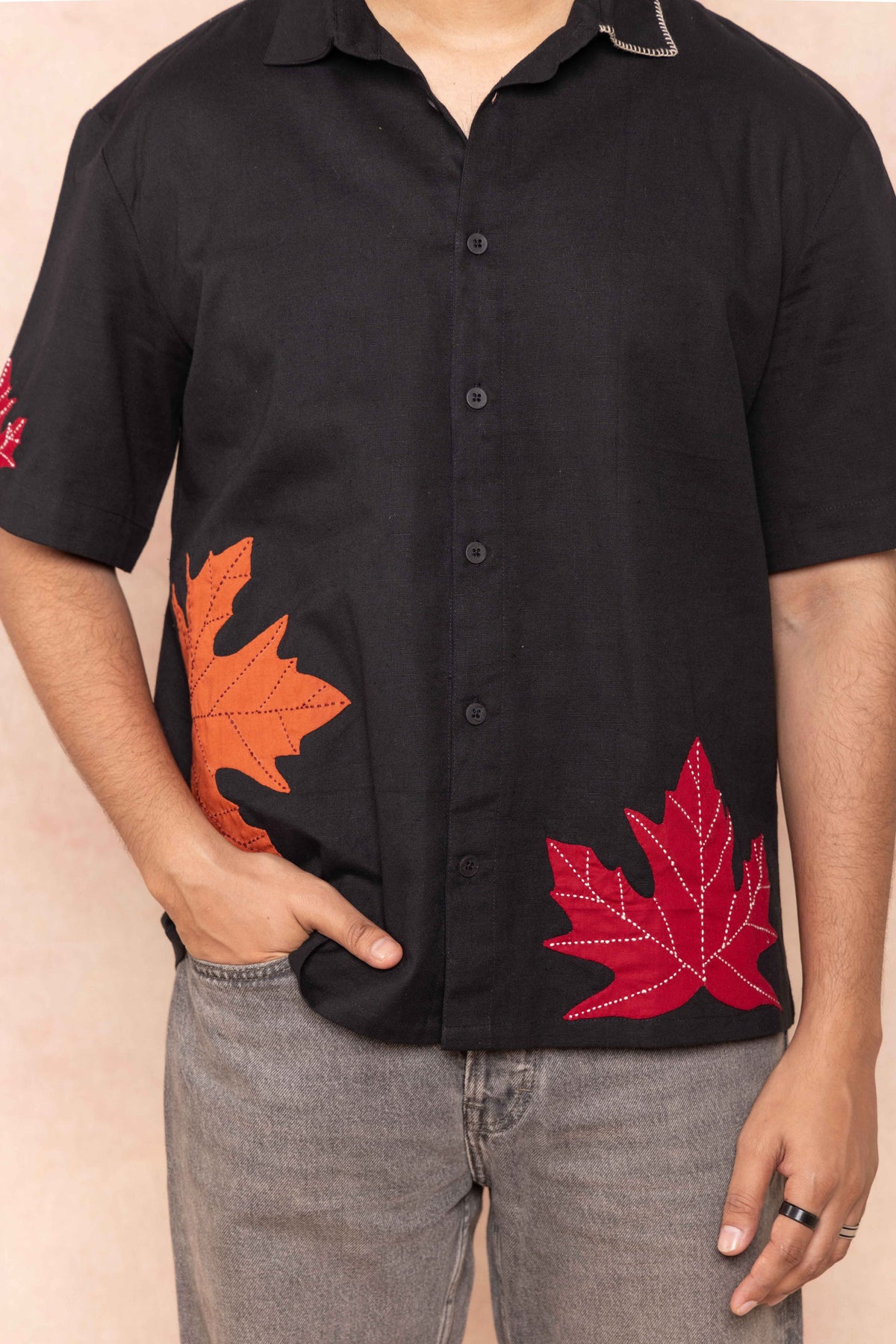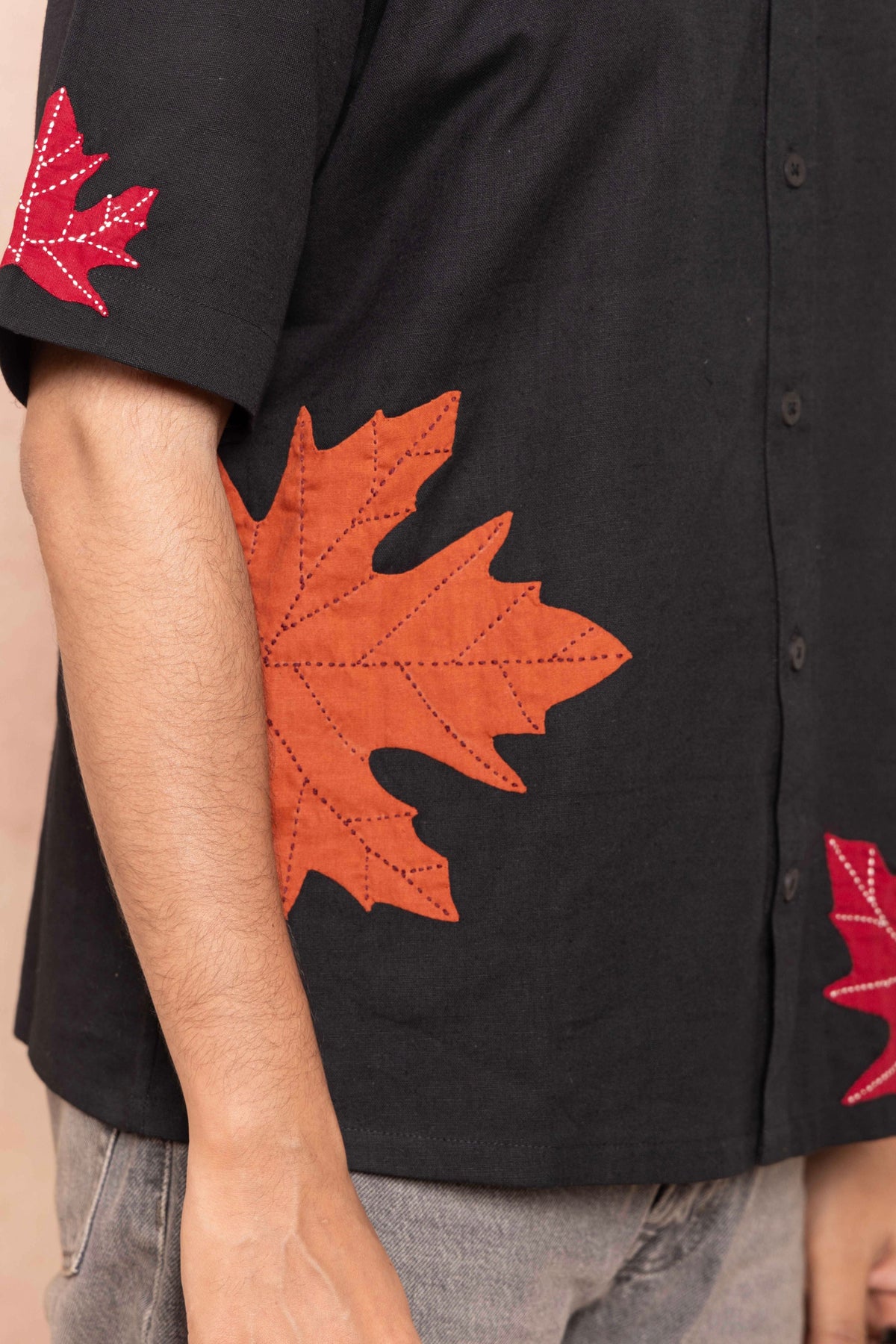 Intricate Kantha work traces the veins of the appliquéd maple leaves, adding depth and texture to the design. Has a subtle detailing on the collar.