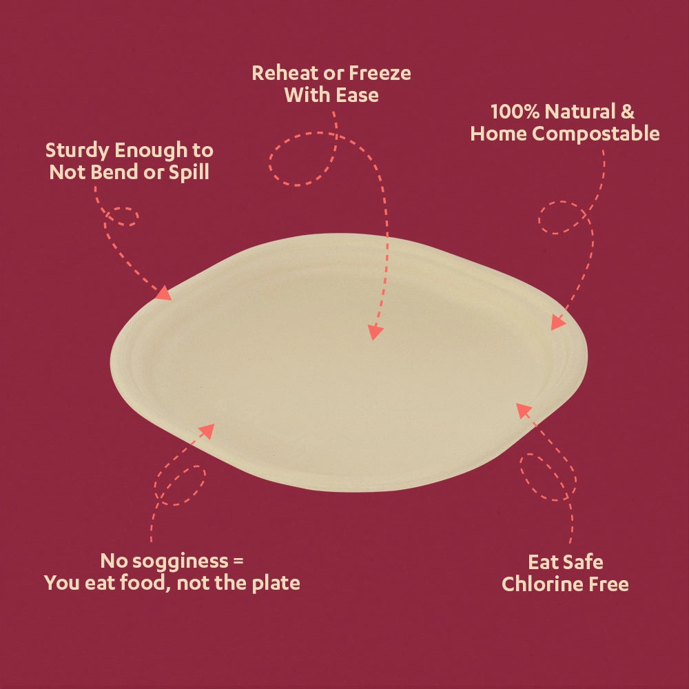 Just Right Plate! Chuk 9” compostable sugarcane bagasse plate is the perfect companion to your meals. Not too big for a plate of biryani, not too small for a serving of dal-chawal. It’s the jack-of-all-trades, master of all plates! This eco-friendly disposable is sturdy, stylish, and sustainable. Your conscience and customers will thank you!