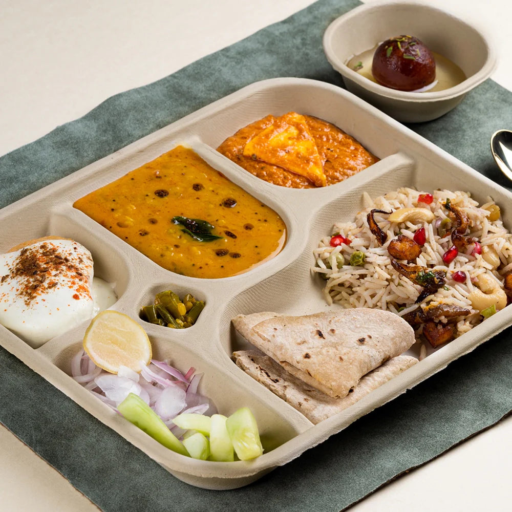Chuk 5 CP meal plate is your ultimate mealtime companion with five compartments ready to serve up a feast. Crafted from eco-friendly sugarcane bagasse, this disposable meal tray is built to handle everything from saucy mains to tasty sides, all while keeping them perfectly in place. Ideal for those who love serving a variety to their customers, this eco-friendly disposable is as safe as it is strong—and when the meal’s over, it’s compostable too.