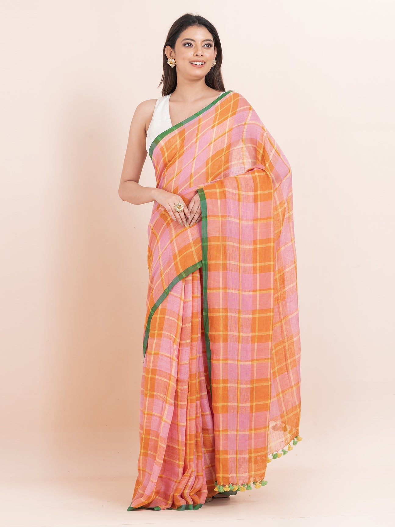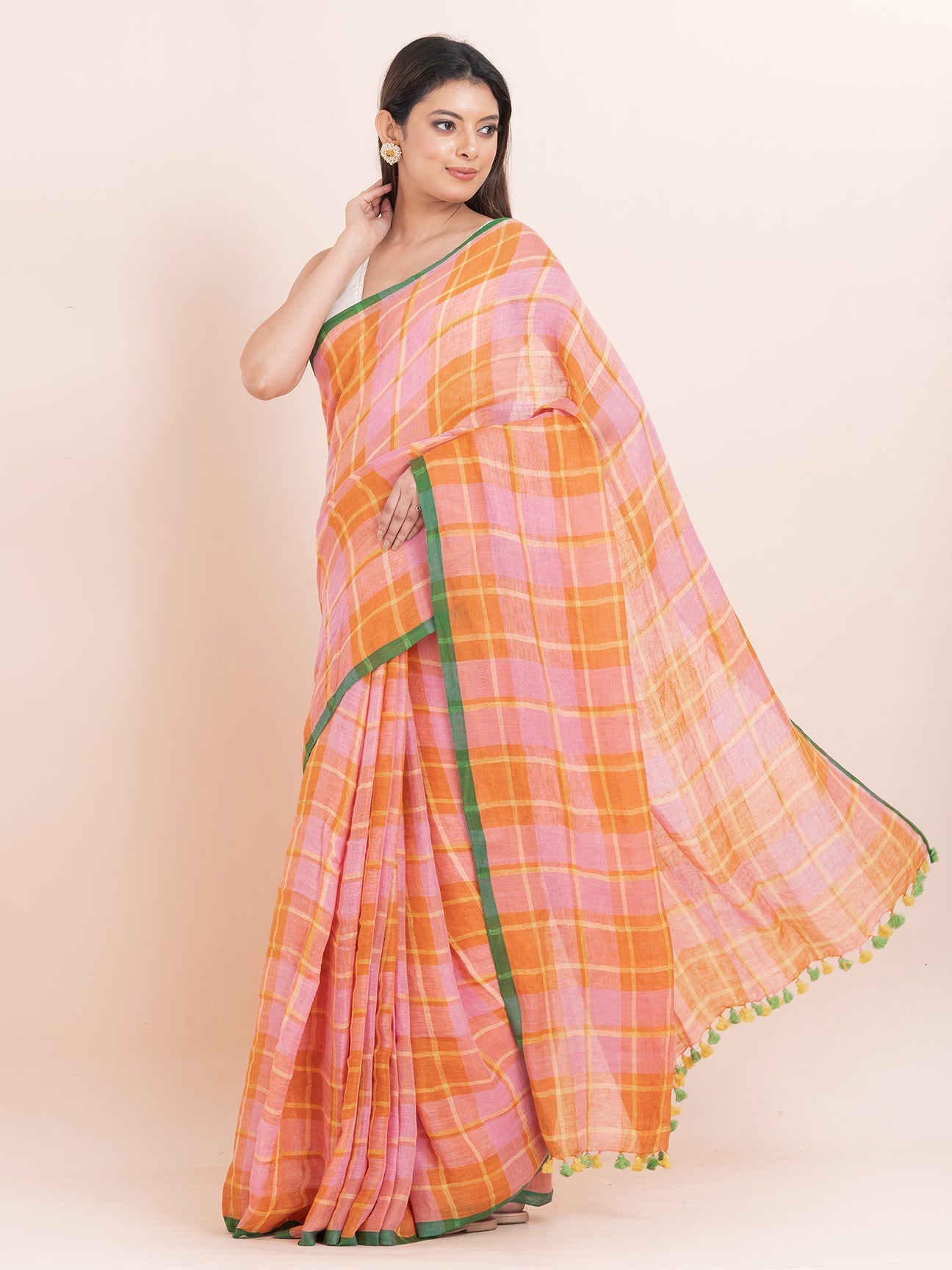 OCAU Citrus Dream - Pure Linen Checkered Saree With Blouse Piece  l Tangerine