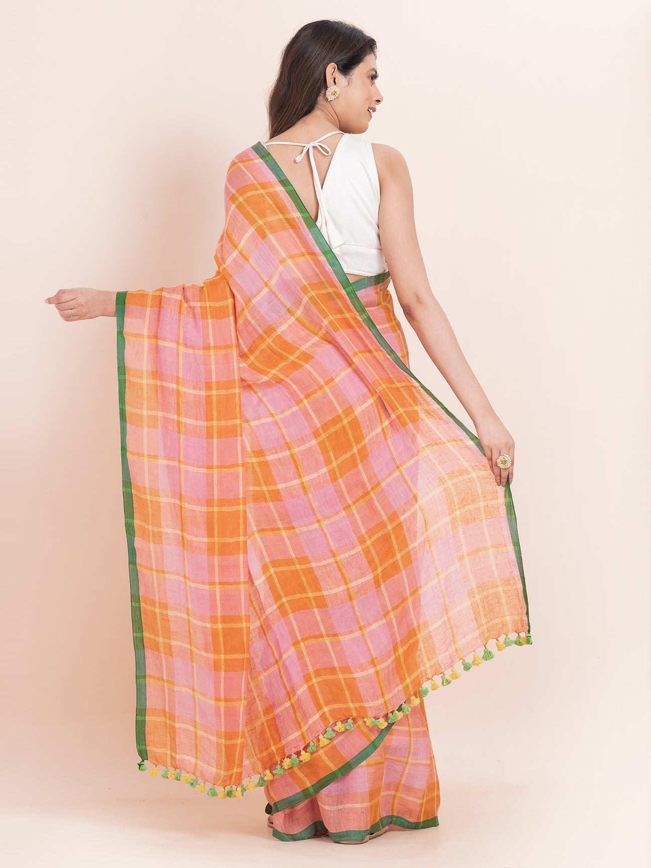 OCAU Citrus Dream - Pure Linen Checkered Saree With Blouse Piece l Tangerine