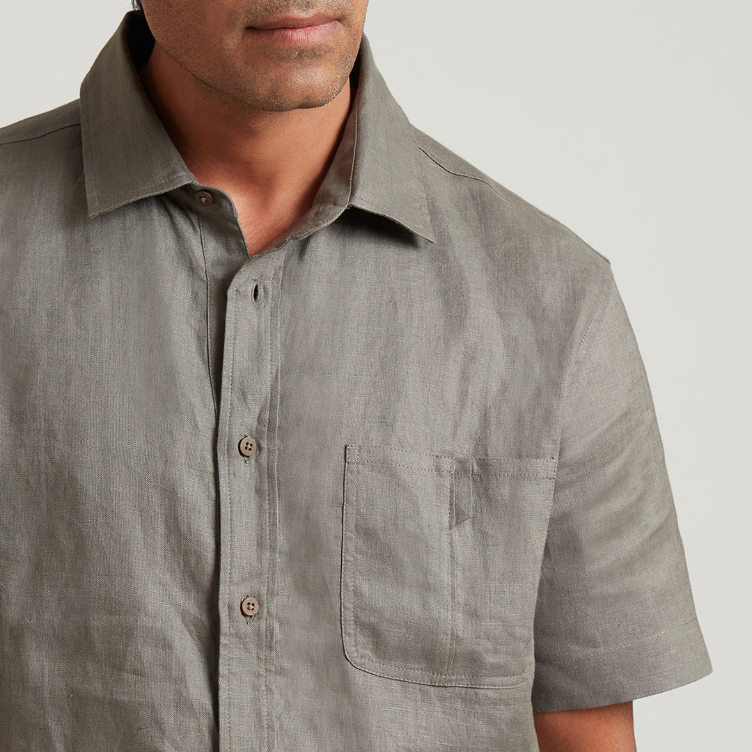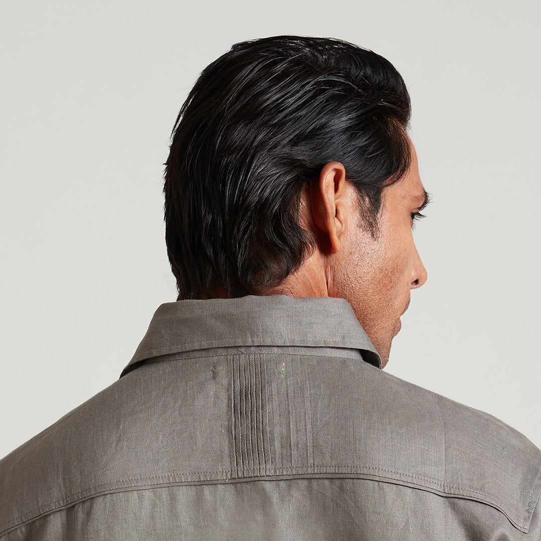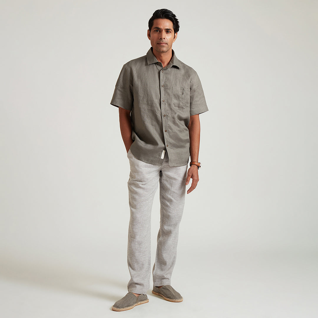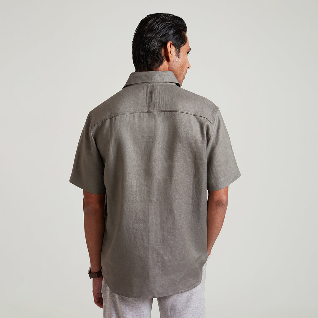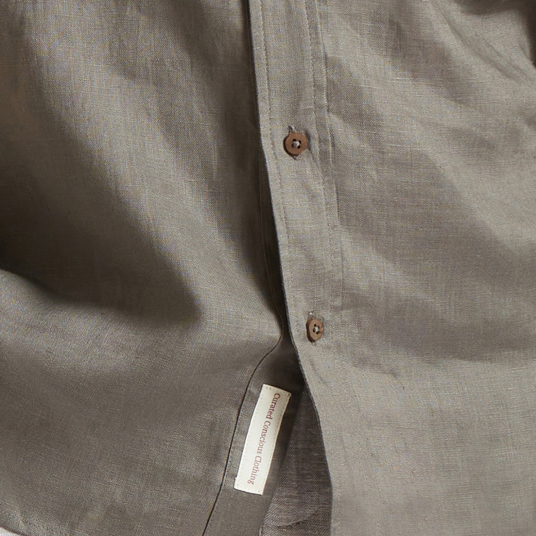 Elevate your casual wardrobe with the B77 Gray Soil Organic Linen Half-Sleeve Shirt, perfect for everyday wear or travel. Crafted from fine-count organic linen, this shirt is lightweight, breathable, and designed for comfort. Its relaxed fit, wide collar, and French placket with coconut shell buttons combine timeless style with practical details. A welt chest pocket, pintuck detailing on the back yoke, and a rounded hemline make this shirt versatile to wear both tucked and untucked. Part of the Voyager Collection, it blends functional design with modern aesthetics for the contemporary man on the move.