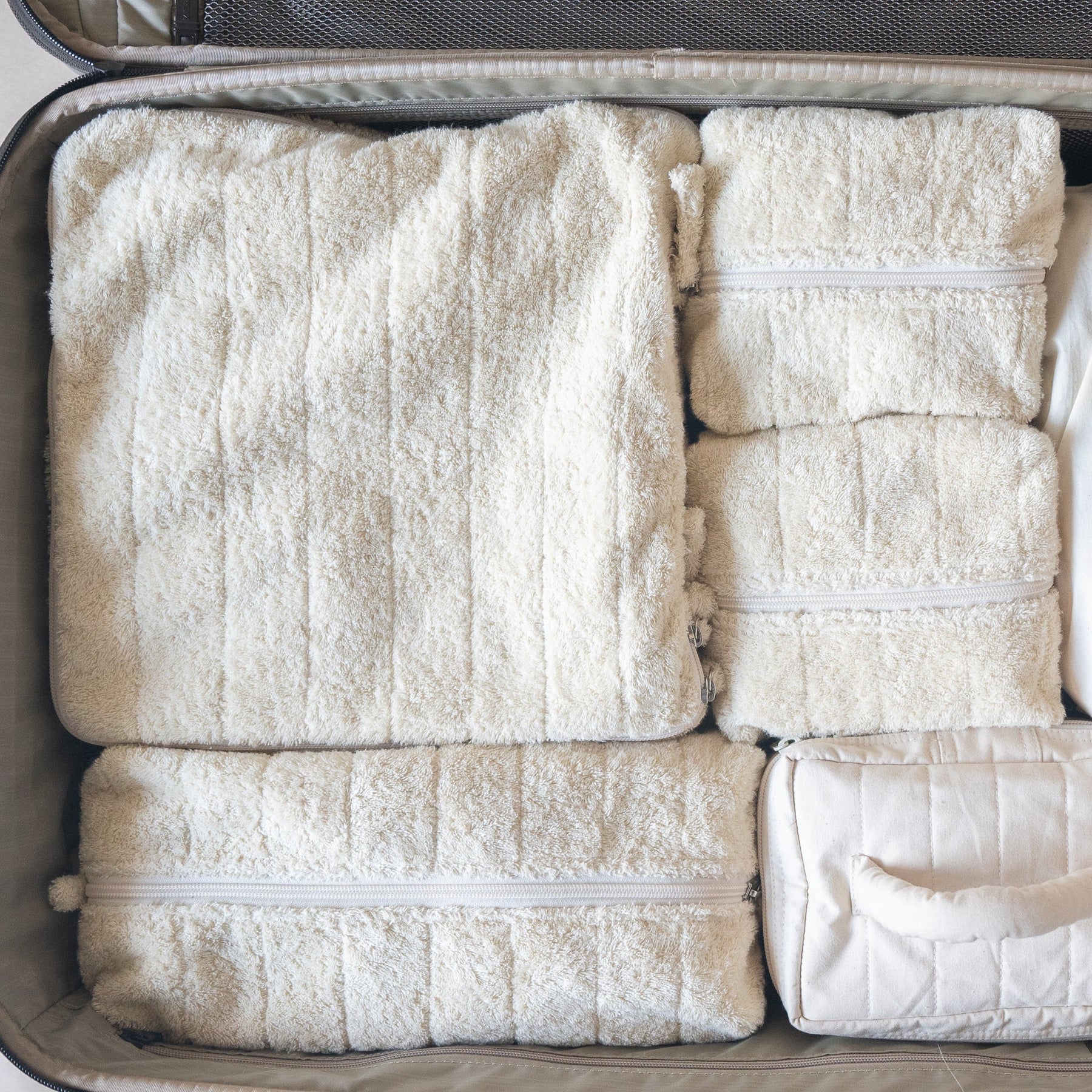 Introducing the Cloud Packing Set, your ultimate travel companion. This set features distinct sized cube pouches that sit together in perfect alignment. Designed for versatility, the mini pouches are ideal for storing cosmetics or tid-bits, the long pouch for storing undergarments or styling accessories. While the largest packing cube can be used to store clothes. The combination ensures efficient organisation of your essentials. The pouches can be placed as required to sit neatly in any suitcase. With a sleek design and durable construction, the Cloud Packing set is a travel must-have.