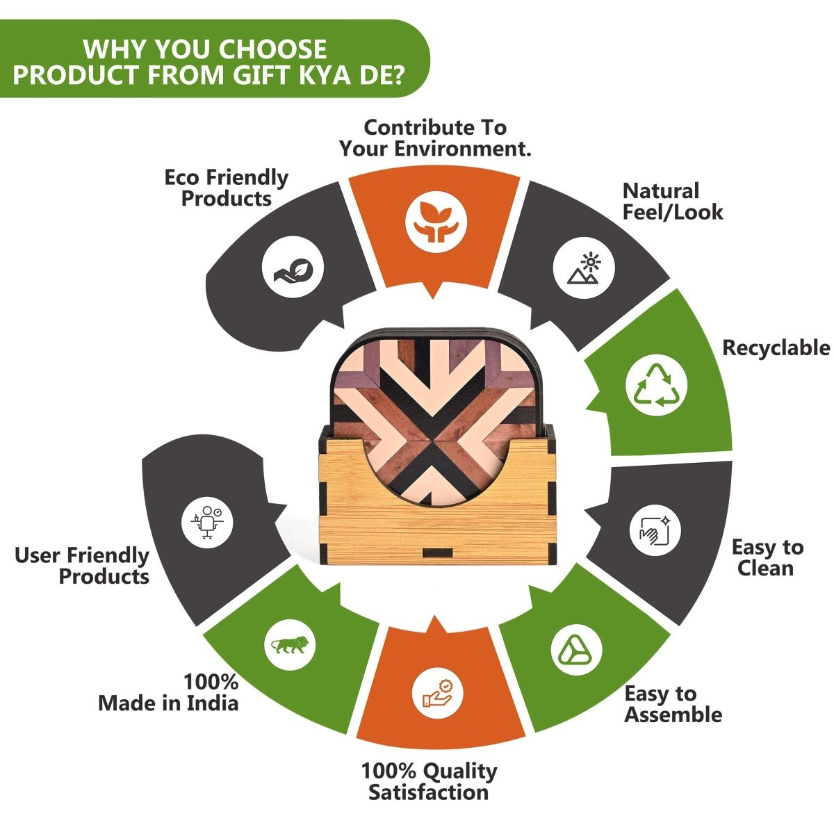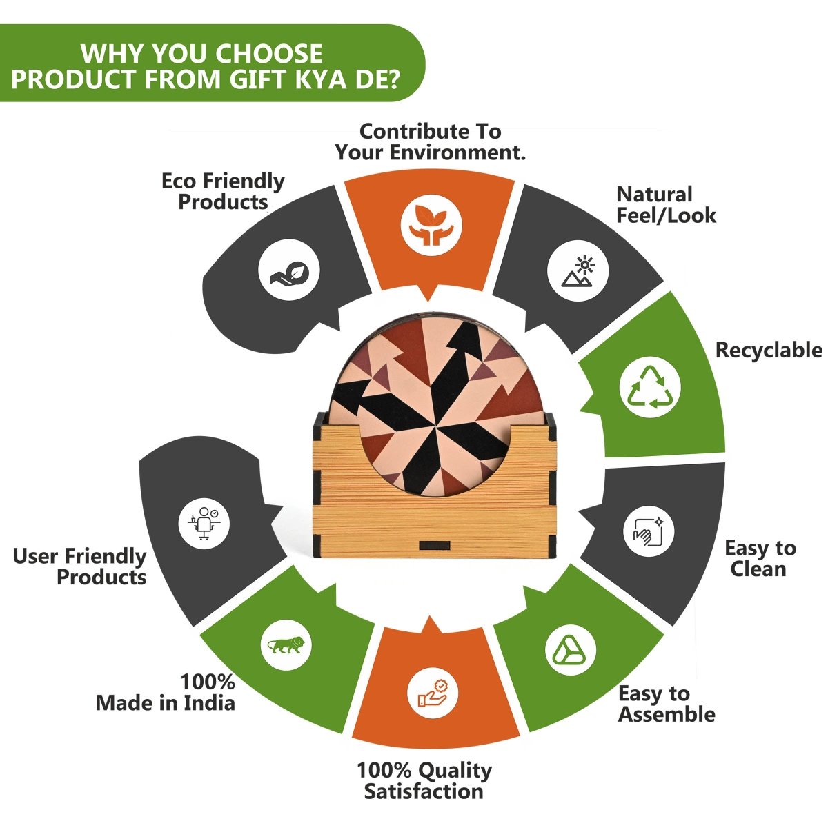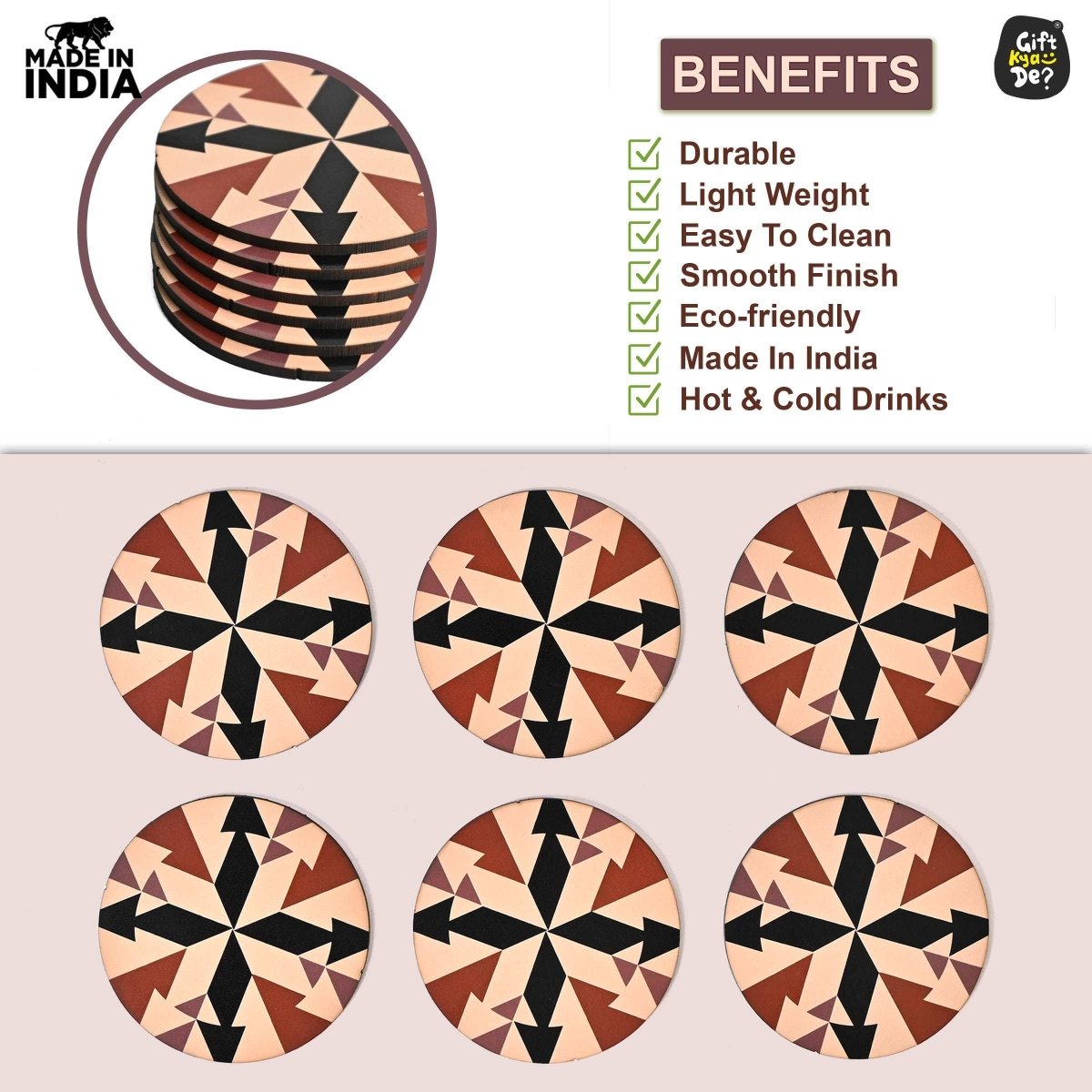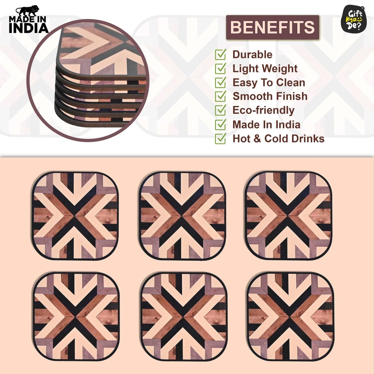 Build Quality: Coaster stand Is A Very Strong And Sturdy Build Quality Made Up Of 3.2 Mm Polished MDF Engineering Wood To Last Longer And Light In Weight, Made With A Quality Product, And Very Easy To Clean. Strong Quality, Not Easy To Break.