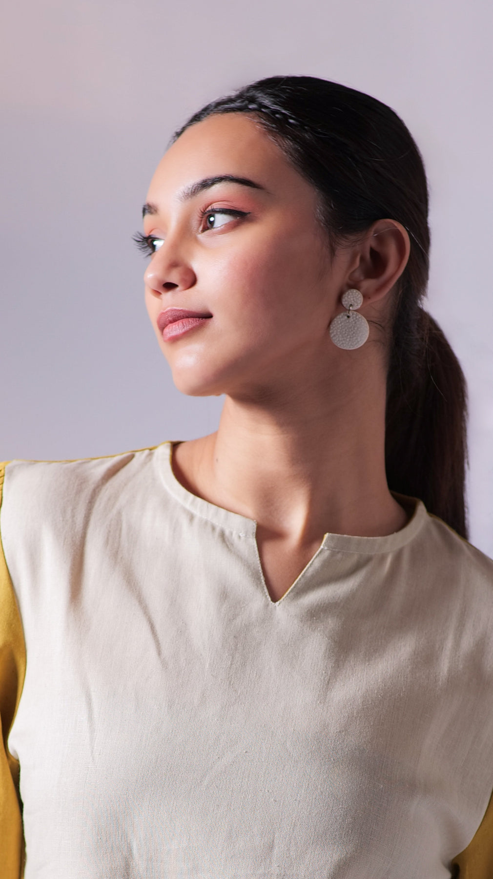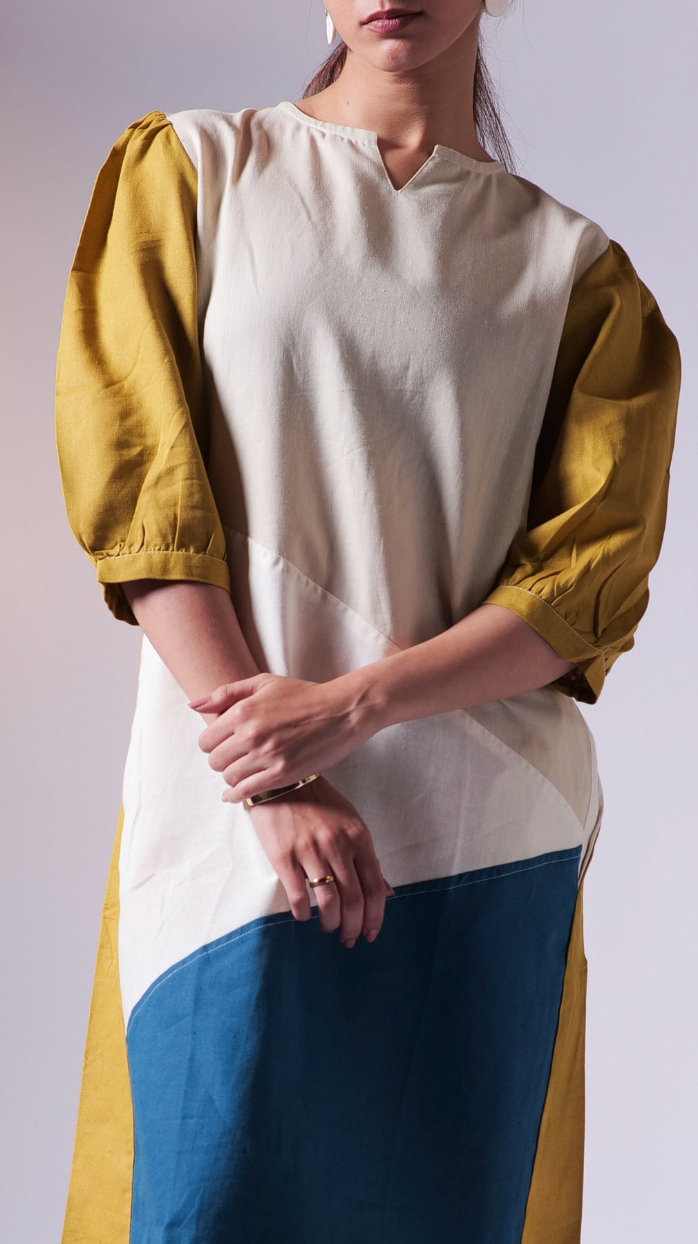 - The dress features a bold colour block pattern with refreshing tones, combining mustard, beige, white, and teal in geometric sections. This design adds a contemporary touch, making the dress stand out with minimal accessories.