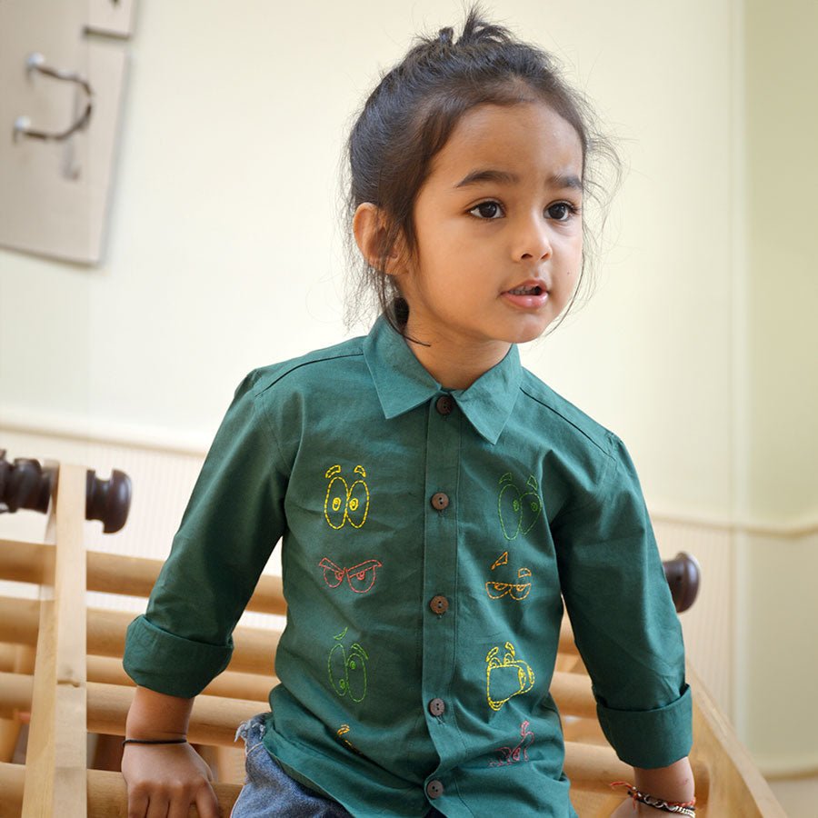 Colourful Emoji Eyes Embroidered Unisex Shirt - Bottle Green - Suspire