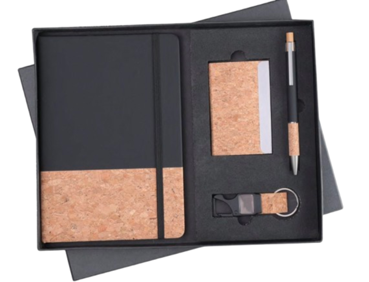 Make a lasting impression with this eco-elegant corporate gift set featuring a unique cork and black matte finish. Ideal for companies that value both style and sustainability, this set includes:
