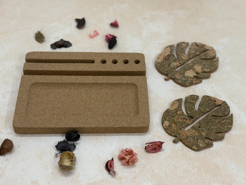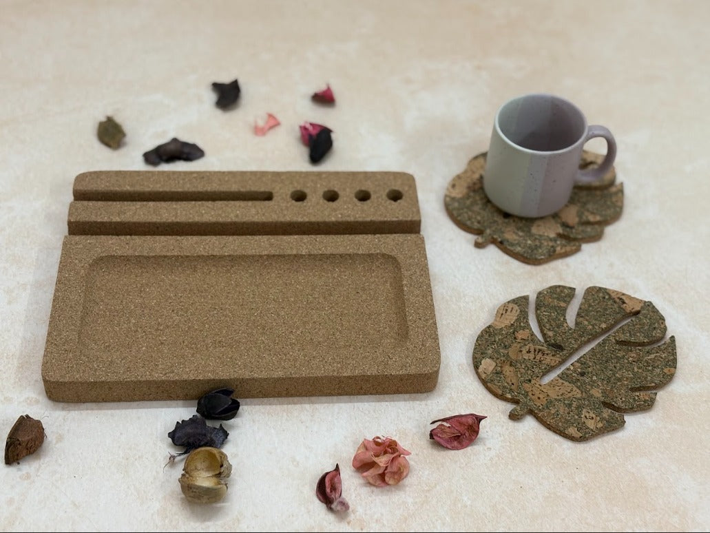 Elevate your workspace with the Cork iPad Desk Organizer with Leaf Coasters Combo—where organization meets nature and sustainability.