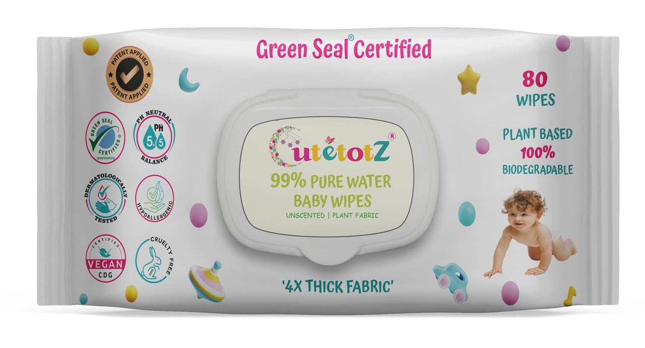 CutetotZ® Baby Wet Wipes - Plant based, 100% Biodegradable, Green Seal® Certified, Fragrance Free, 99% Water Wipes (PATENTED).
