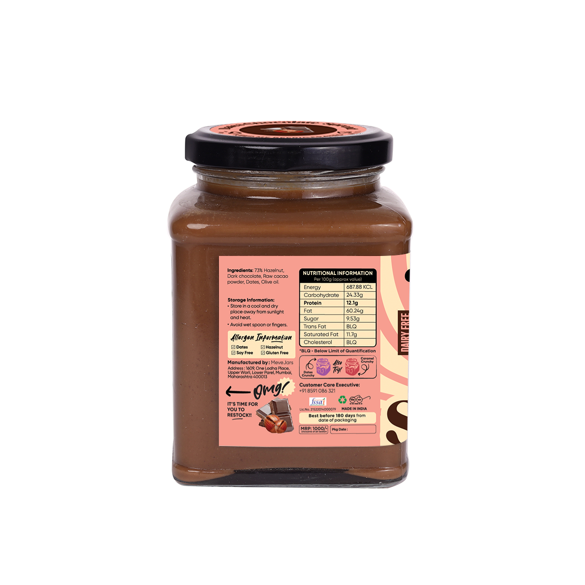 Meet Meve Jars’ Hazelnut Spread with Dates – 73% Turkish Hazelnuts, dark chocolate, raw cacao, dates, and olive oil, all packed in one jar of joy! Perfect for the health-conscious people, thanks to our date-sweetened formula. Elevate your mixed berries, stir into your coffee, or layer on chia pudding and apple slices. Guilt-free indulgence just got tastier