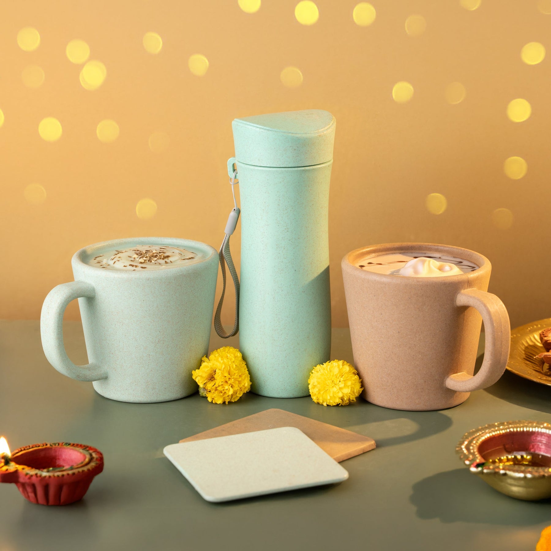• 2 pcs Mighty Mugs: Enjoy your coffee or tea in these sturdy, sustainable mugs made from rice husk.