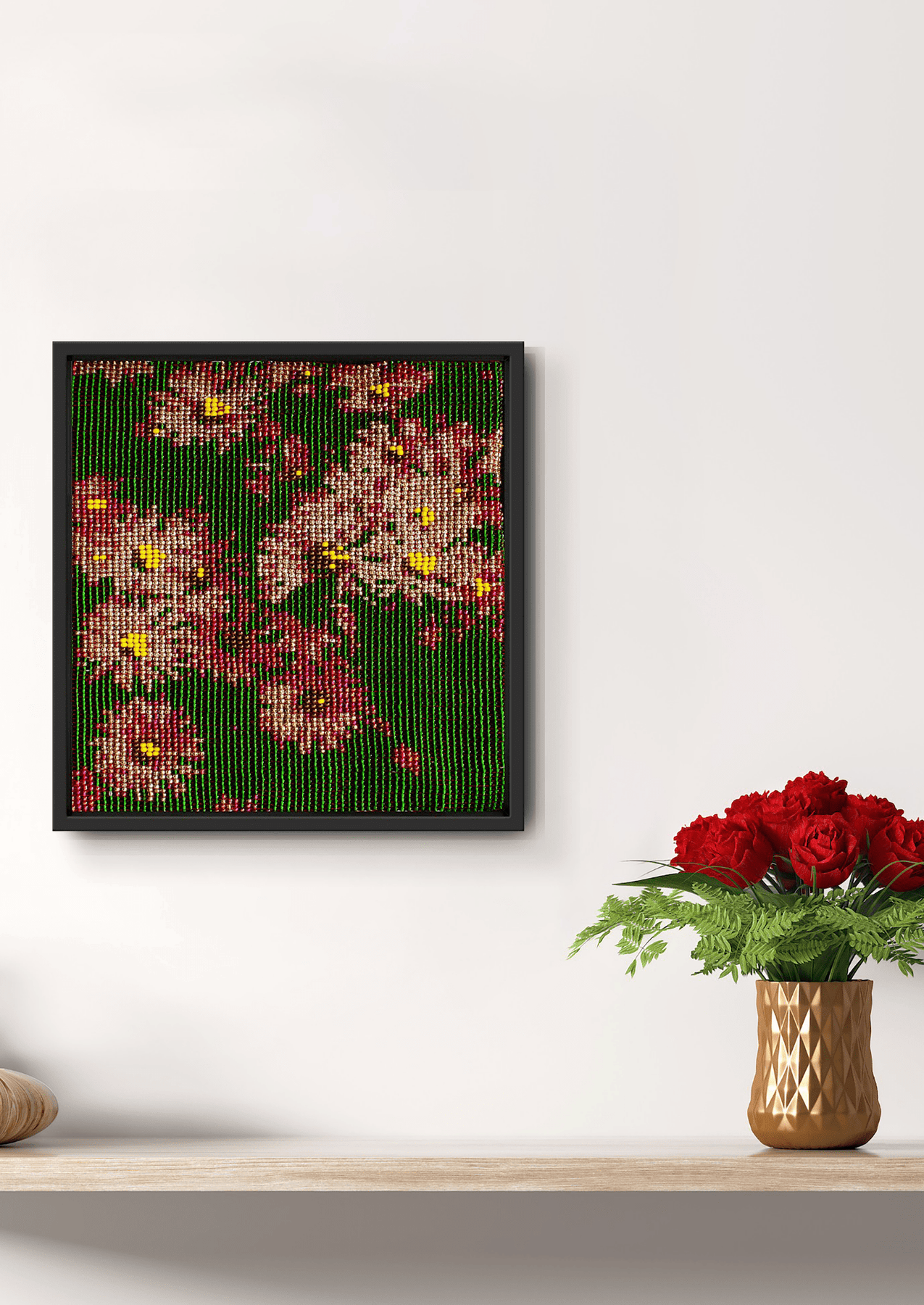 About the Collection: Handwoven on simple wooden looms by artisans in Bhavnagar, Gujarat, this piece embodies India’s fading bead-loom tradition. Tiny glass beads are woven into intricate patterns inspired by nature and geometry, preserving a craft once used to create torans that symbolized welcome and good fortune. Each artwork tells a quiet story — a meditative play of texture, light, and patience.