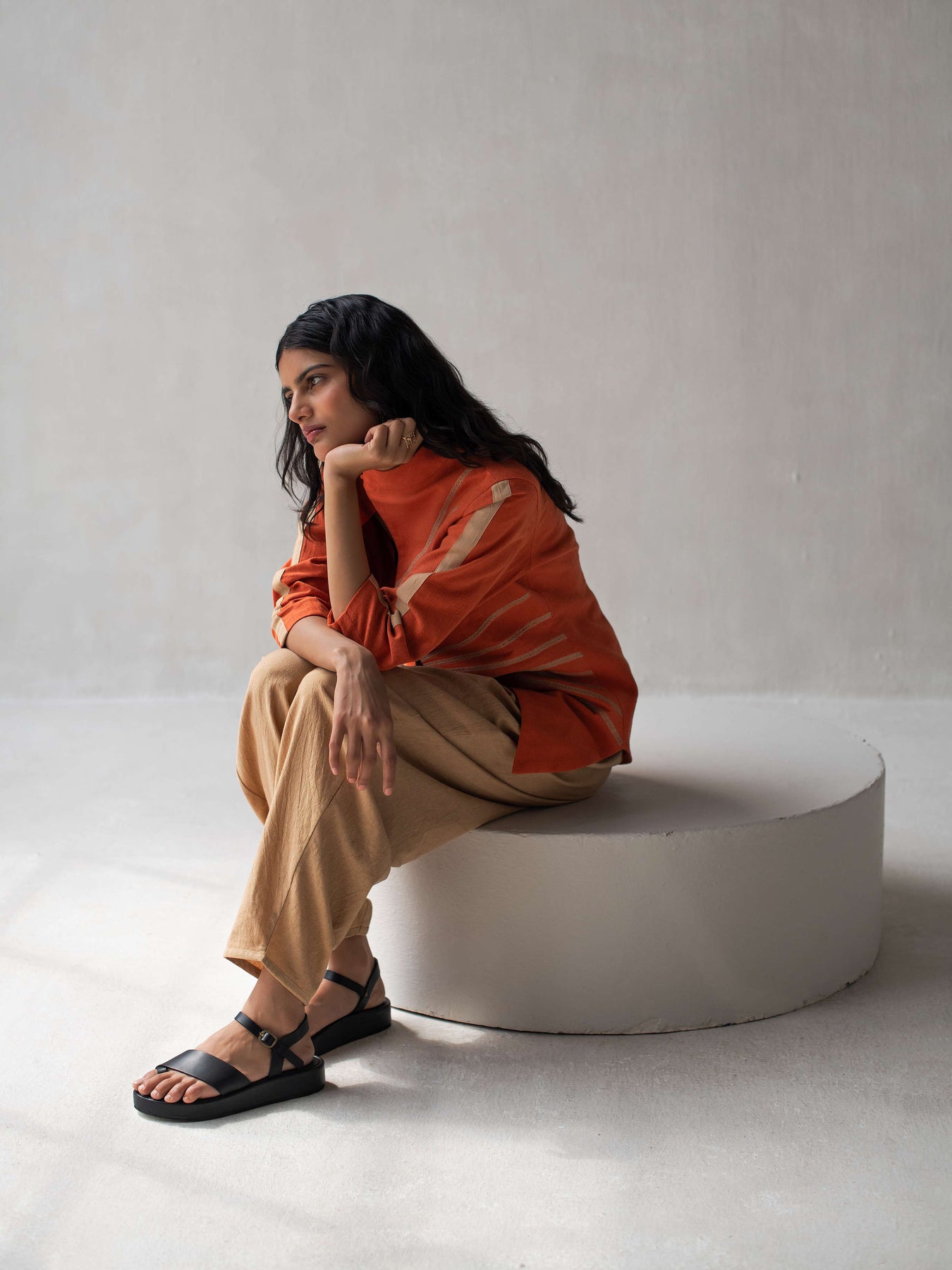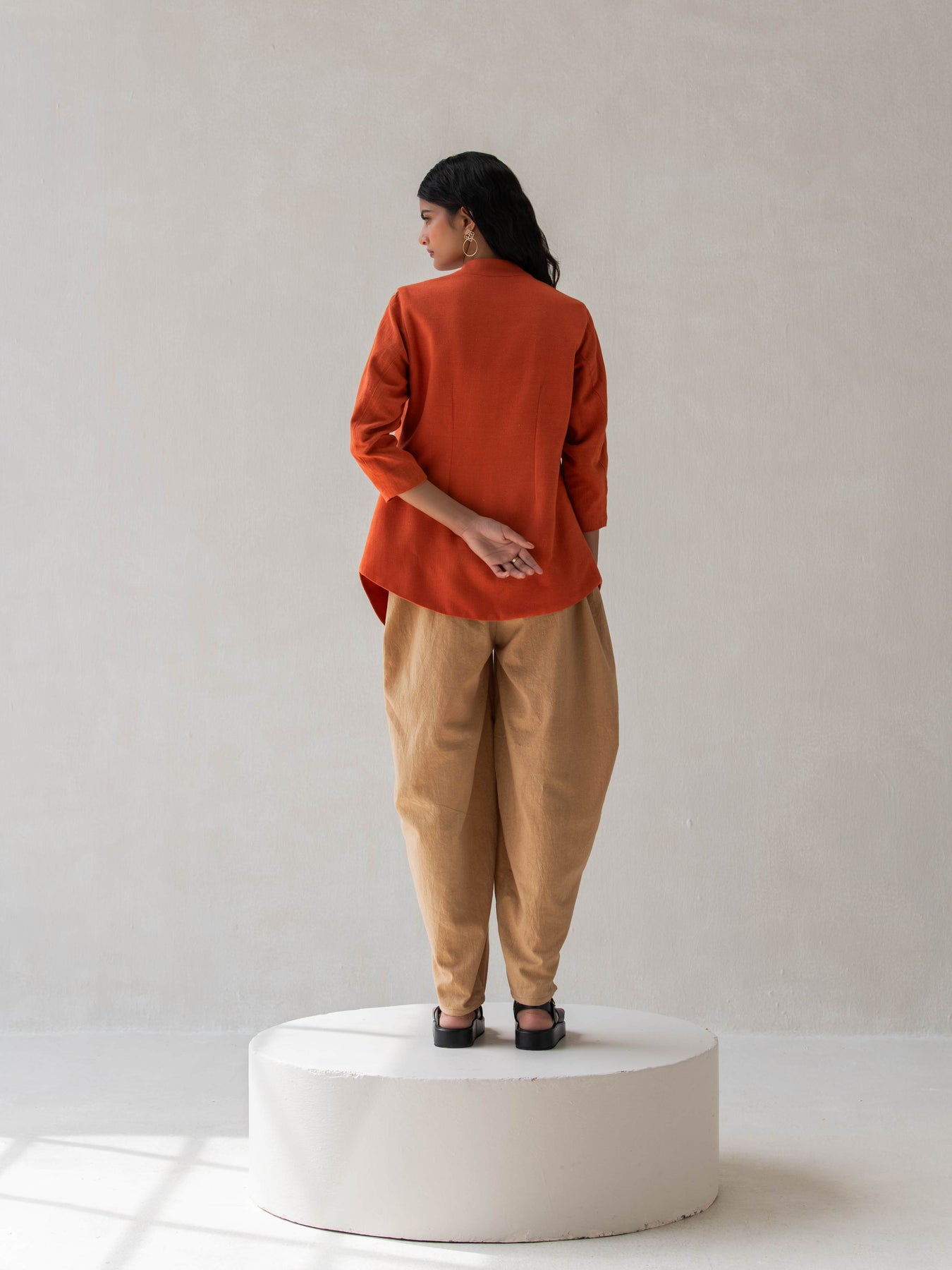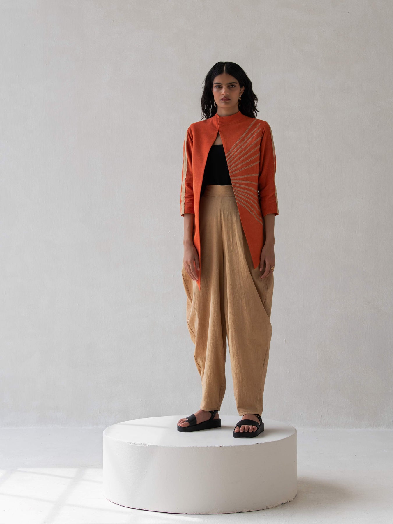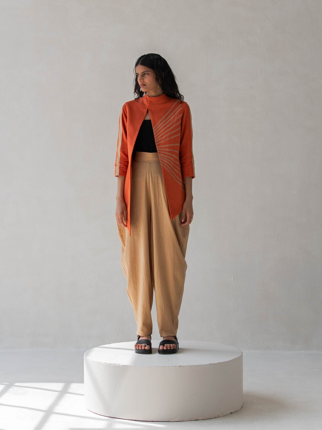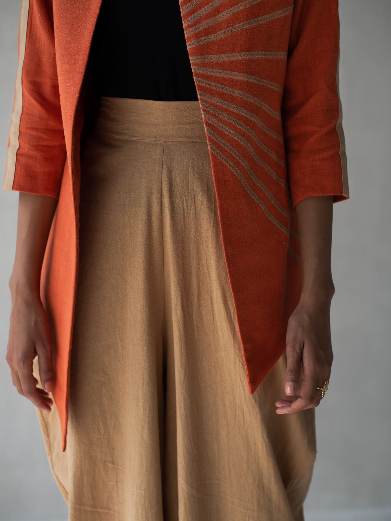 Crafted from organic kala cotton, these dark beige dhoti pants embody timeless elegance with a sustainable twist. The breathable, textured fabric offers a natural, airy feel, ensuring all-day comfort. The cowl silhouette creates a flattering, relaxed fit that adds movement and flow to every step. Designed for versatility, these pants transition effortlessly from day to night. Pair them with a fitted crop top or a breezy blouse for a casual-chic look, or style them with a structured jacket and bold accessories for an elevated ensemble. Whether for a relaxed outing or a special occasion, these dhoti pants make a conscious fashion statement with every wear.