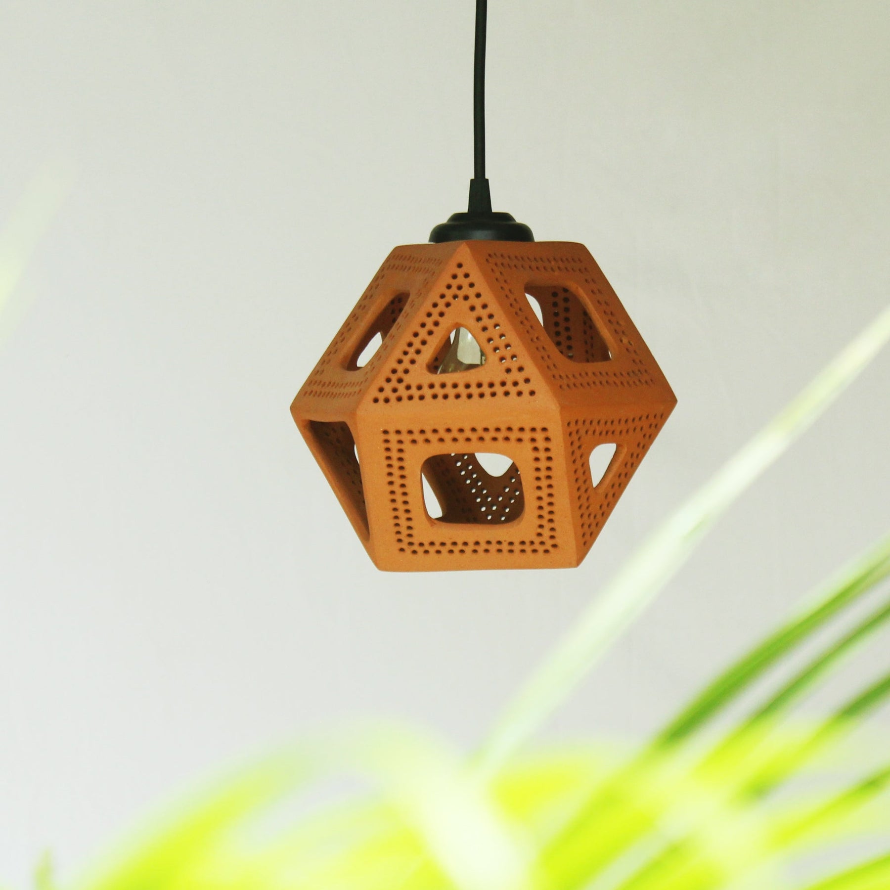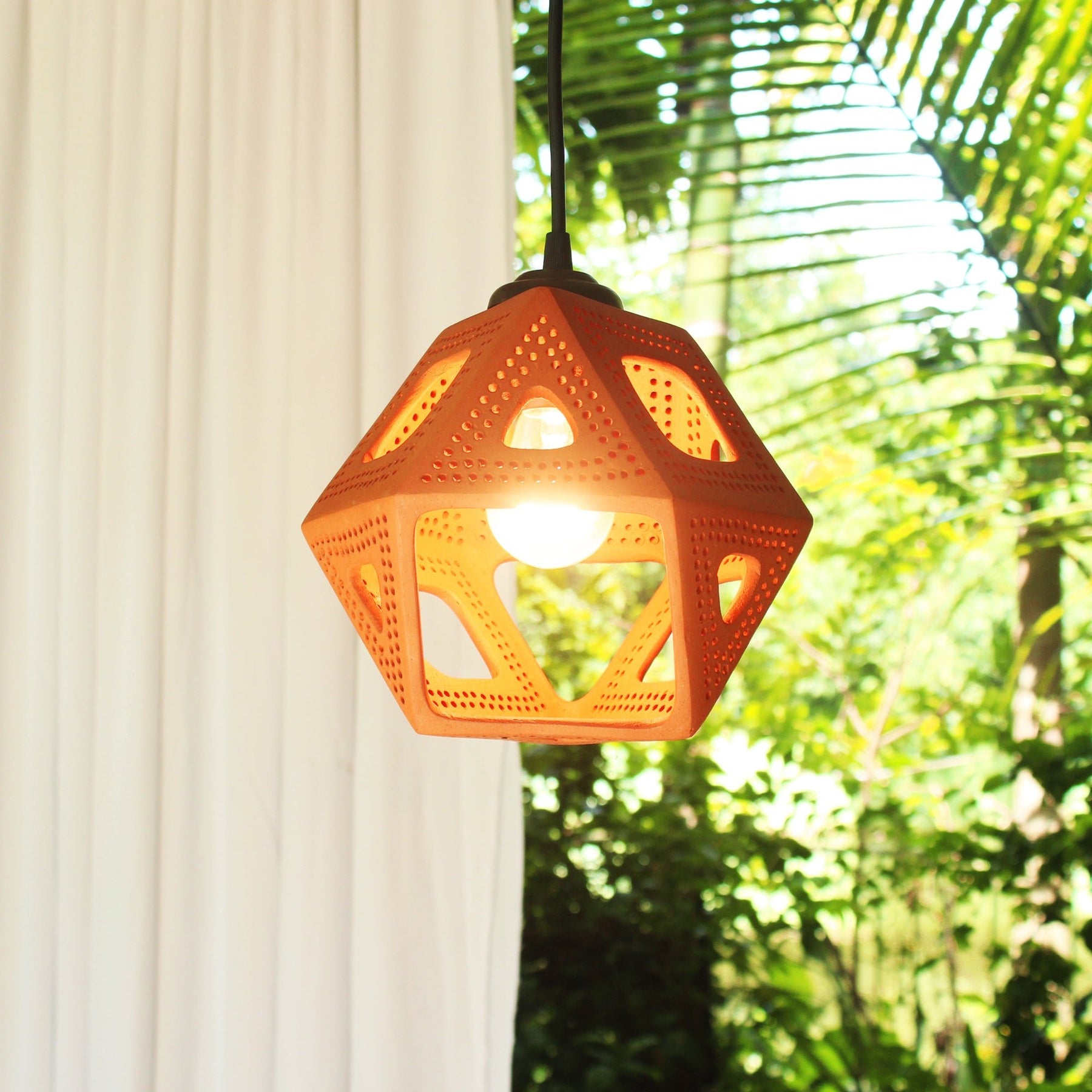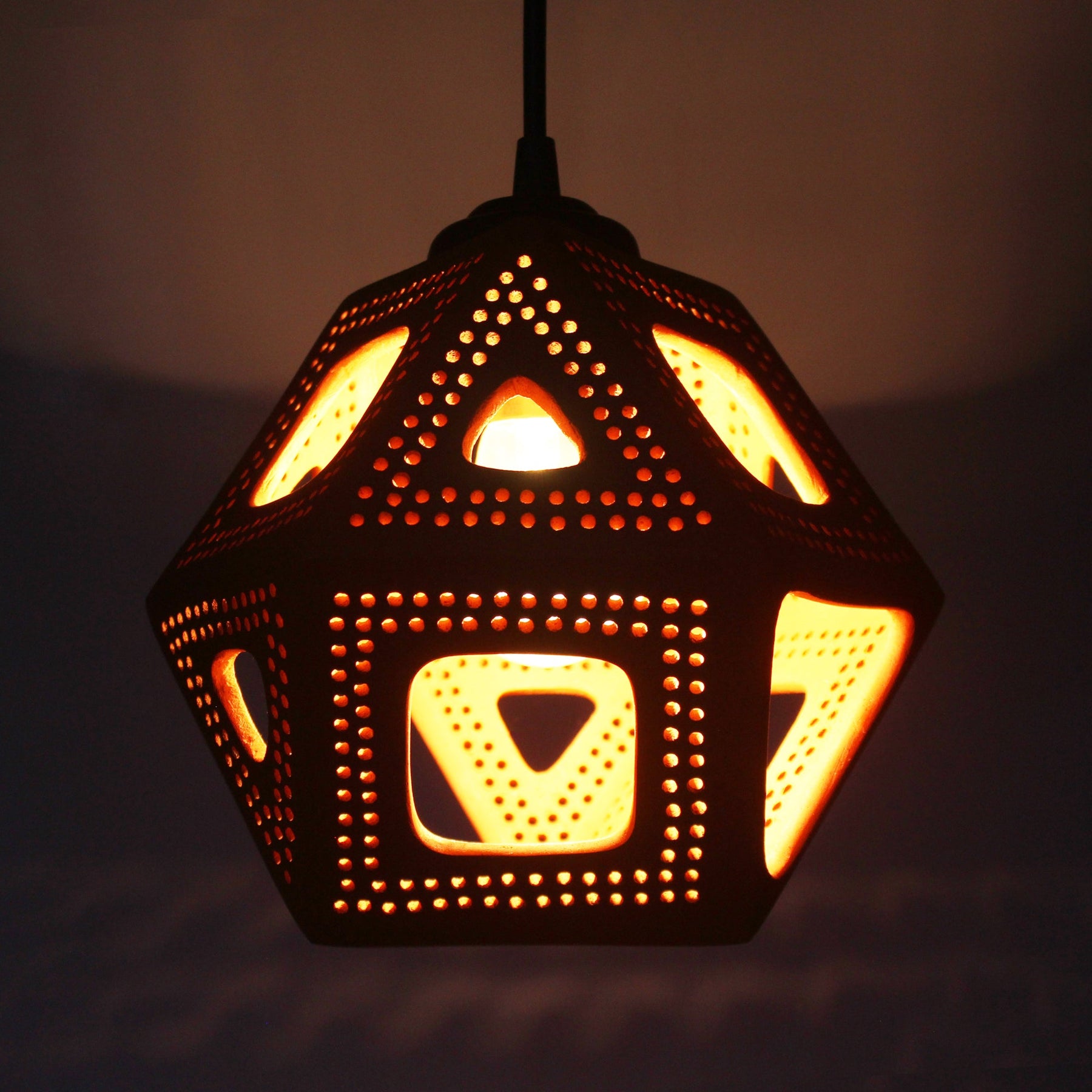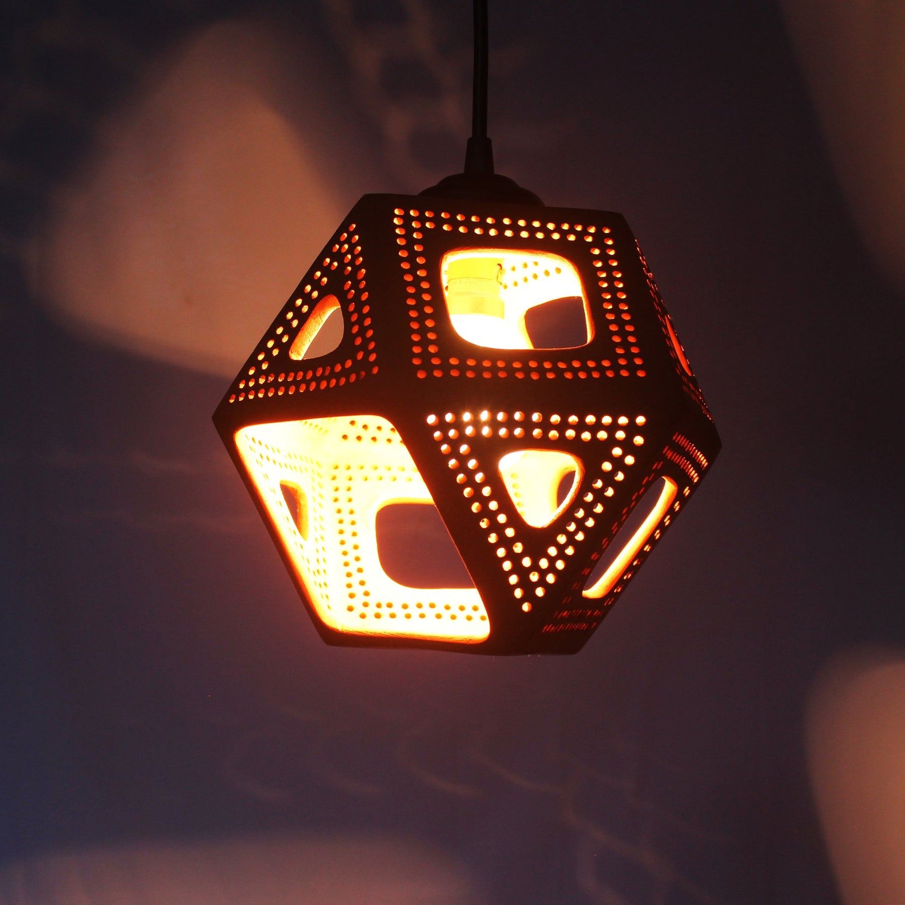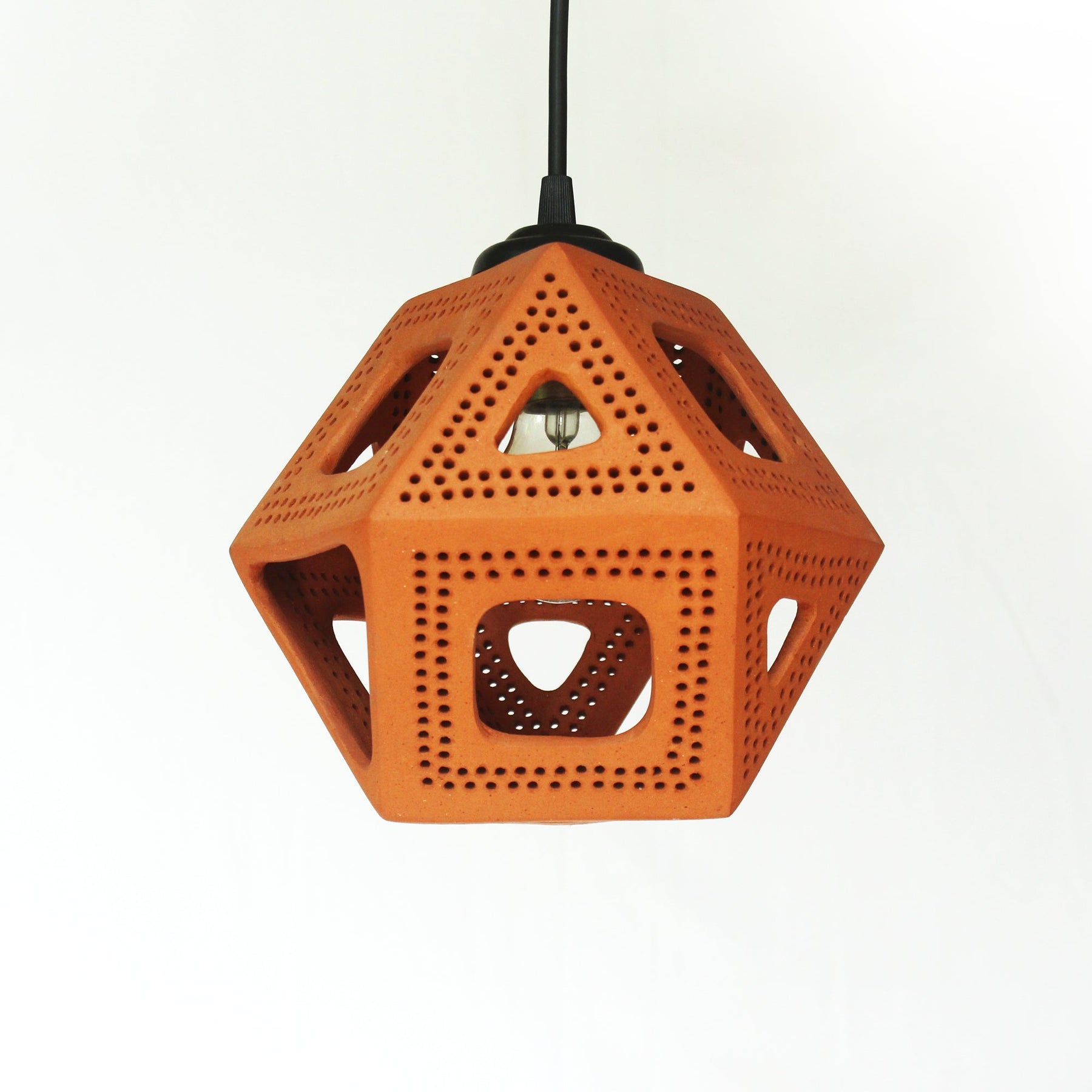 DIAMOND : D’MOND is the Challenging Shape in Terracotta Lighting : looks beautiful if installed in Single or even cluster of multiple pieces. Its truly modern and surprising design which can glorify any space. Main Shells of the Light are made of Burned Clay (Terracotta) and designed with hundreds of perforations. The complete light unit is assembled together with B22/E27 holder & spacer with 6mm dia CE marked PVC wires which can straightway be hanged from ceiling with a help of a MS powder coated canopy as given. Bulb costs are not included with this product price.