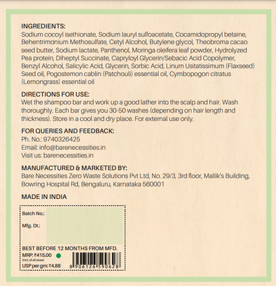 Ingredients: Sodium cocoyl isethionate, Sodium lauryl sulfoacetate, Cocamidopropyl betaine, Behentrimonium Methosulfate, Cetyl Alcohol, Butylene glycol, Theobroma cacao seed butter, Sodium lactate, Panthenol, Moringa oleifera leaf powder, Hydrolyzed Pea protein, Diheptyl Succinate, Capryloyl Glycerin/Sebacic Acid Copolymer, Benzyl Alcohol, Salicylic Acid, Glycerin, Sorbic Acid, Linum Usitatissimum (Flaxseed) Seed oil, Pogostemon cablin (Patchouli) essential oil, Cymbopogon citratus (Lemongrass) essential oil