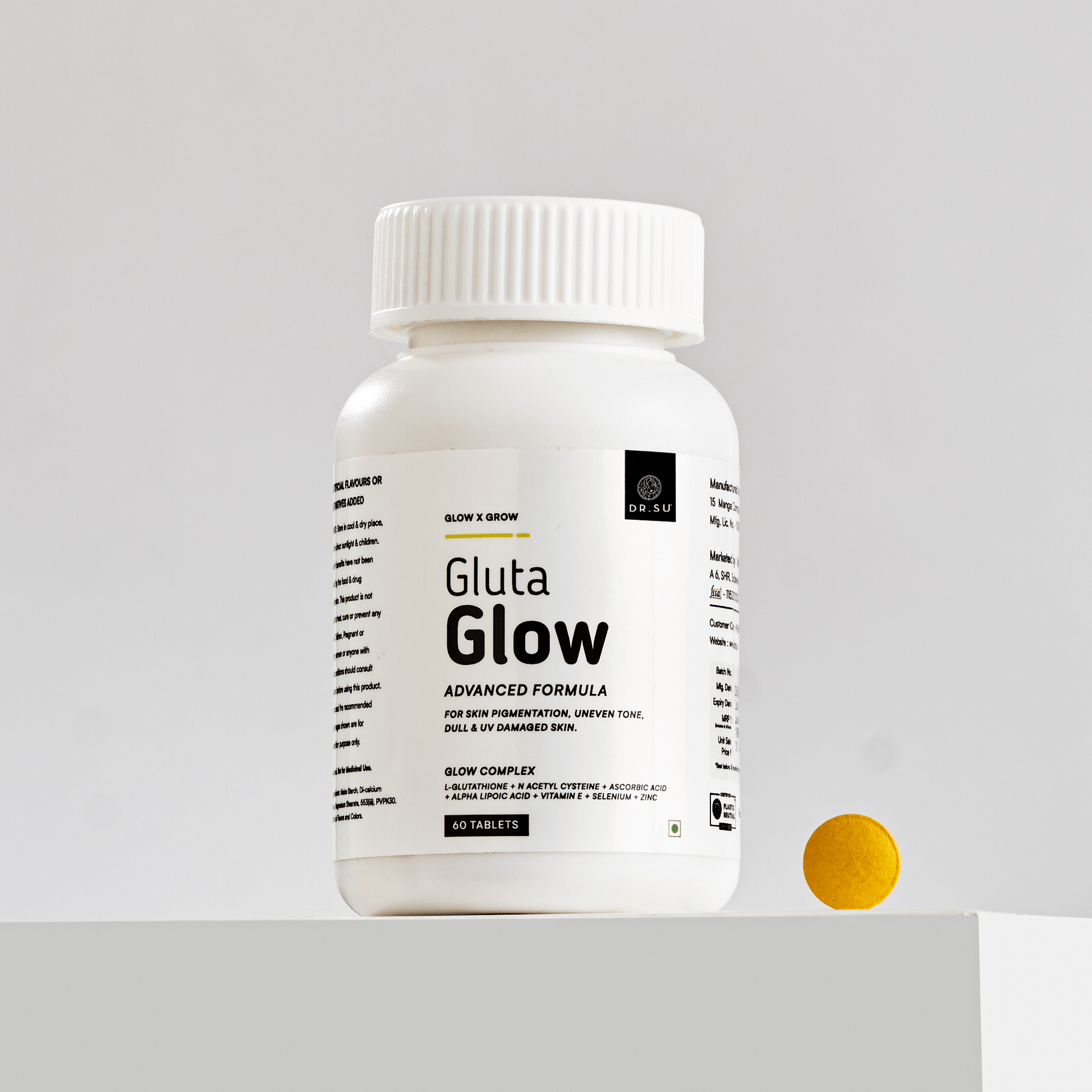 Dr. Su Gluta Glow is an advanced formula of the most powerful research backed antioxidants for skin radiance and glow. It has the golden combination of L-Glutathione with N-acetylcysteine (NAC) and Alpha Lipoic Acid. They are further fortified with Vitamin C & E, Zinc and Selenium. This potent formula is for people with uneven tone, skin pigmentation, melasma, dark spots, dull skin and UV-damaged skin.