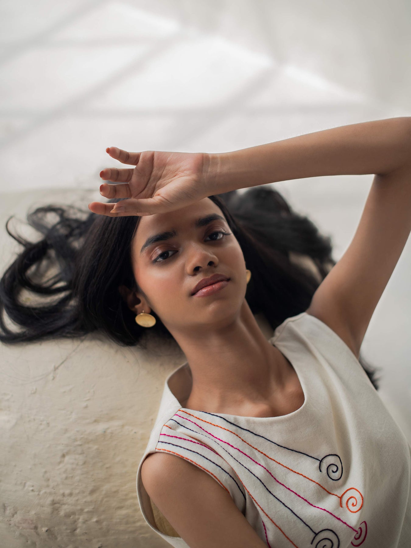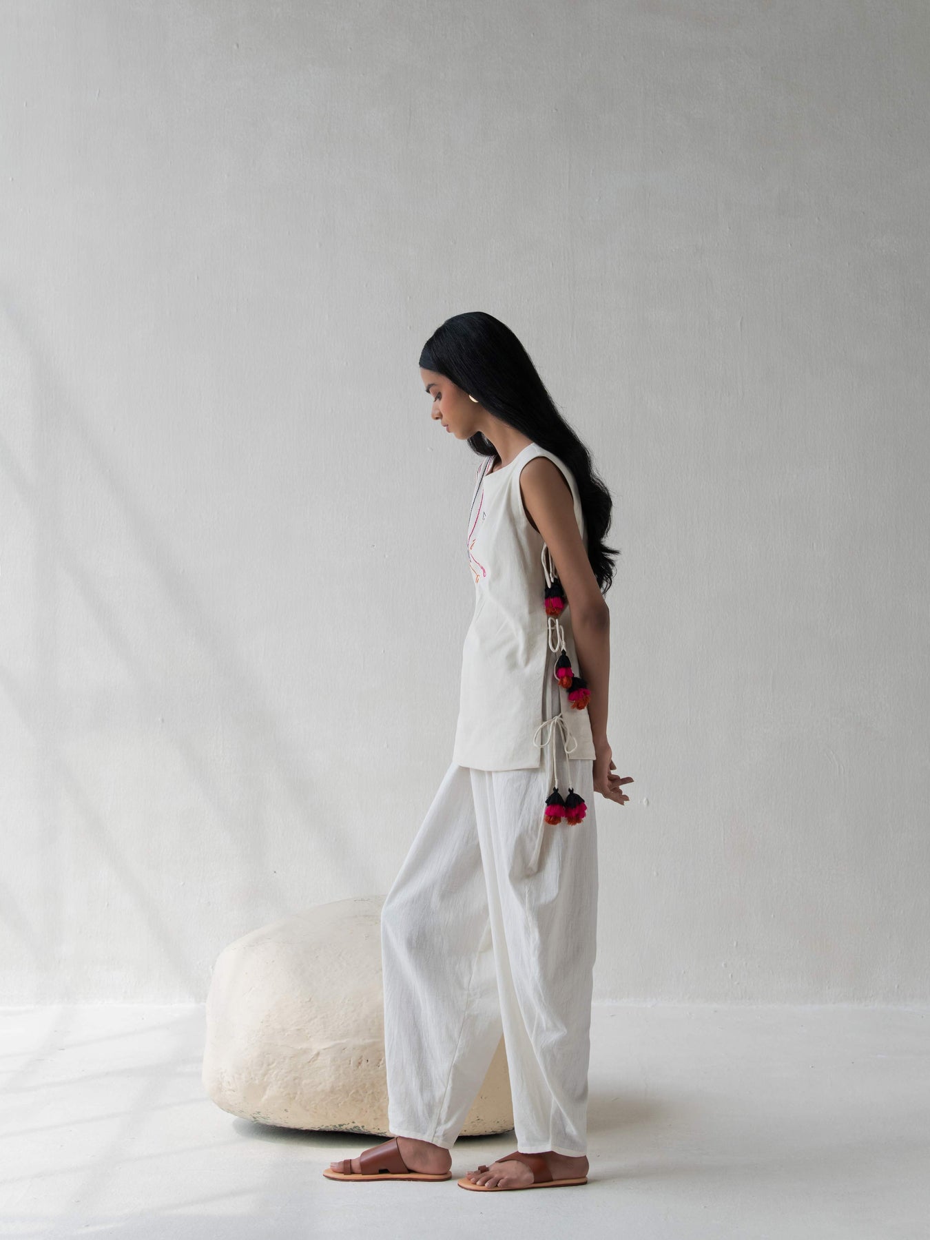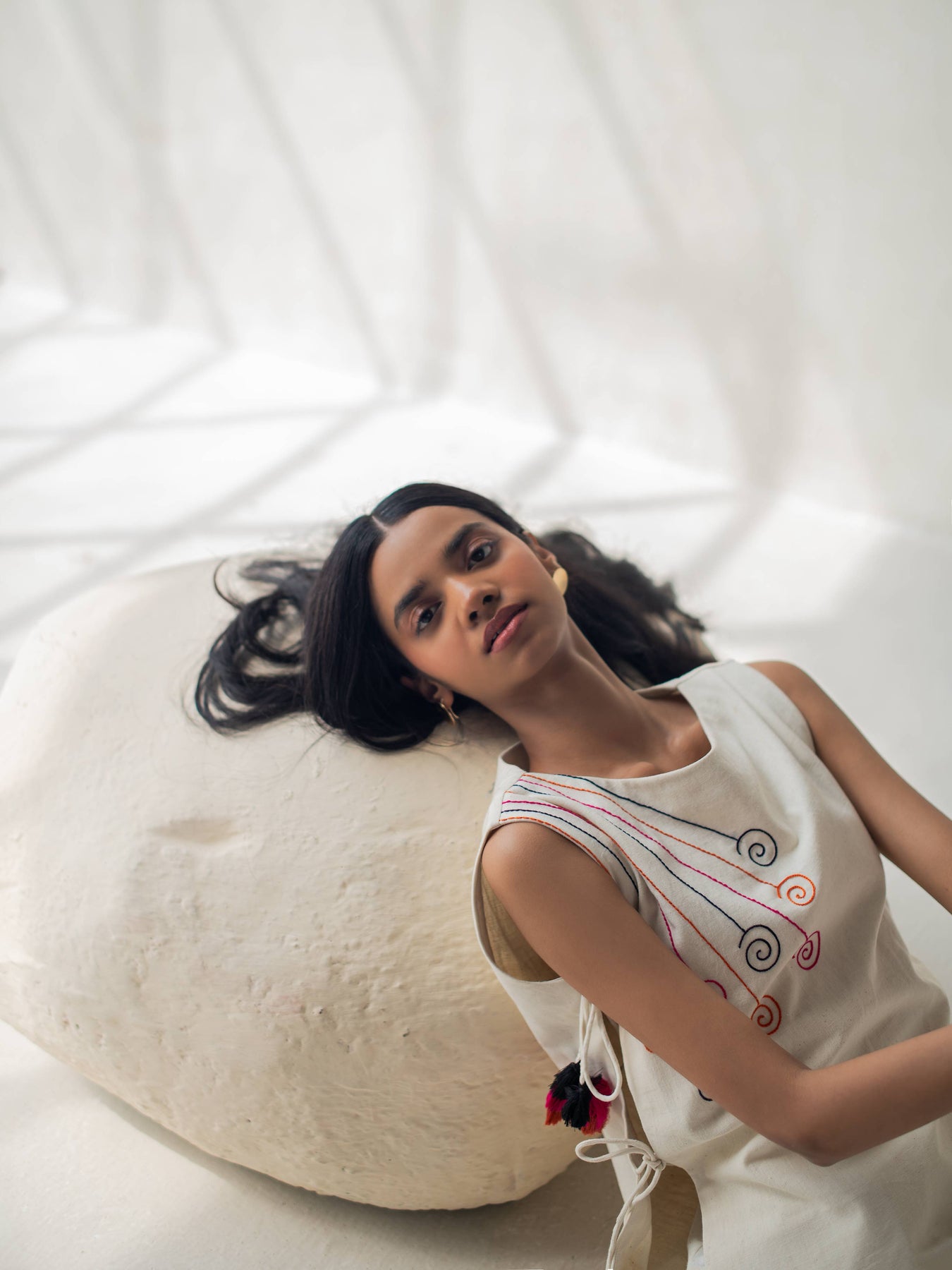 Crafted from organic khadi, this layered top offers a stylish blend of comfort and versatility. The off-white fabric provides a breathable, earthy feel, perfect for all-day wear. The boat neck adds an elegant touch, while the open sides create a breezy, relaxed silhouette. Three drawstrings on each side, adorned with multicolored tassels, allow for adjustable closure, adding a playful and customizable element to the design. Whether styled over a fitted dress, paired with wide-leg pants, or layered with a skirt, this top brings a unique, artistic flair to any outfit while making a conscious fashion statement.