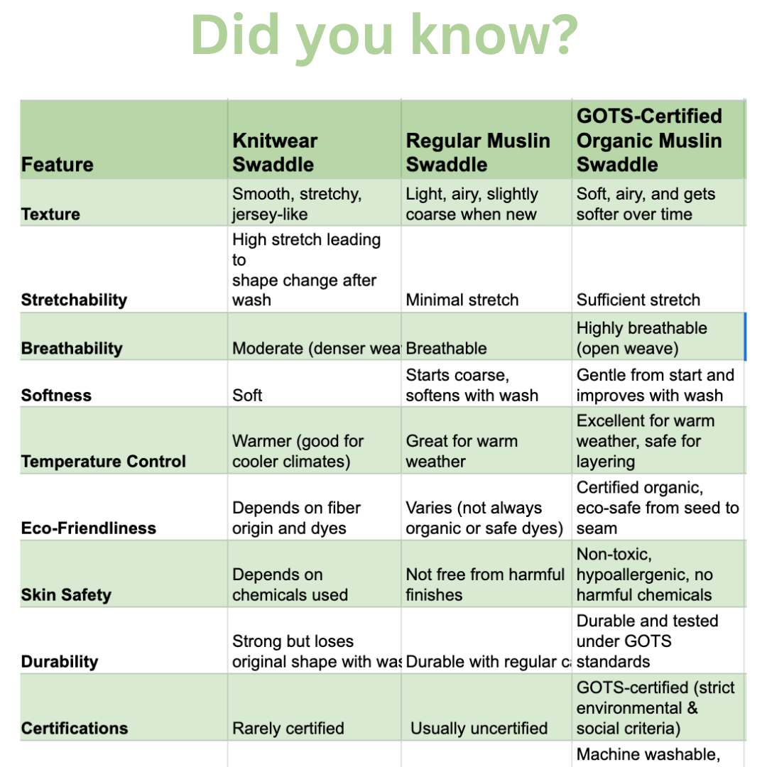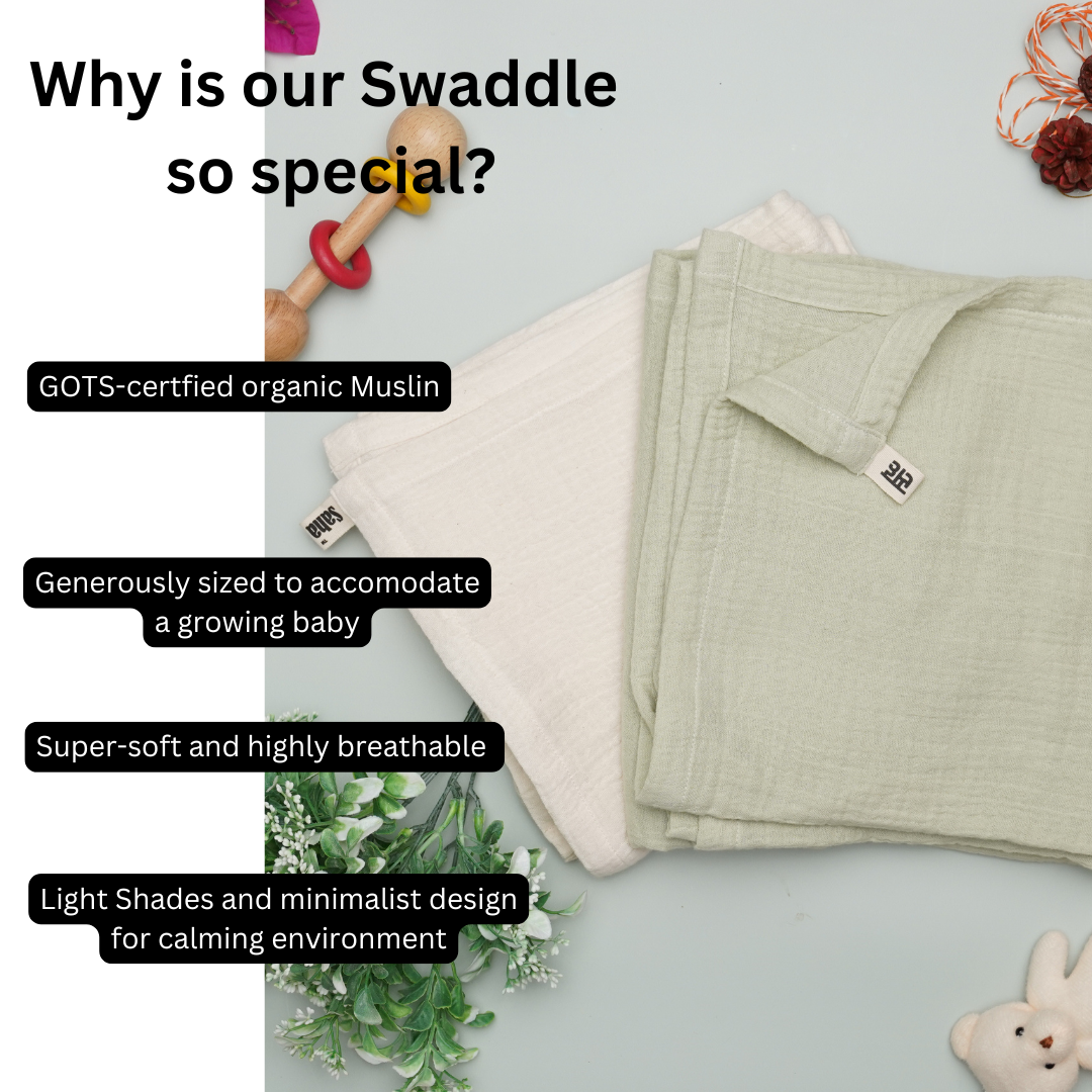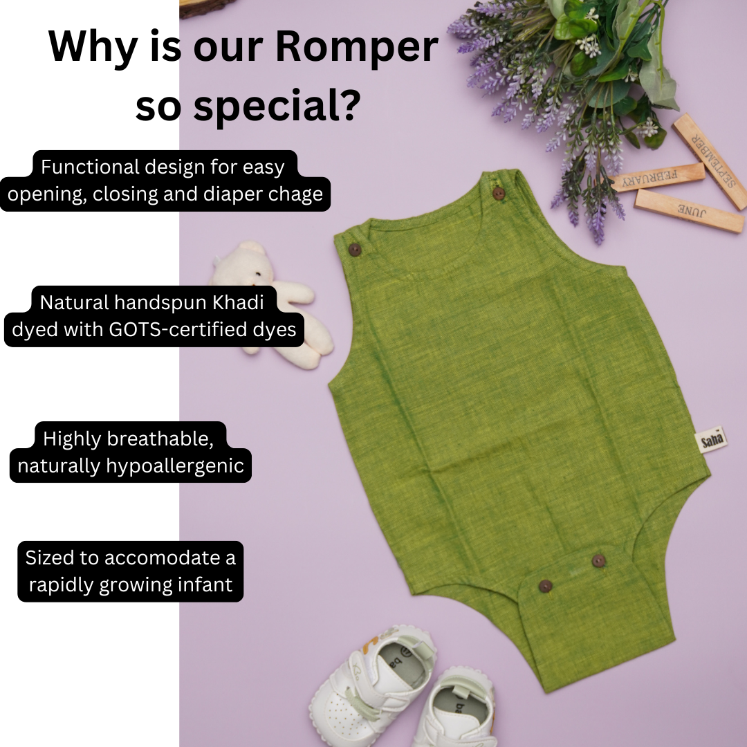 1. Naturally Hypoallergenic & Safe The Khadi romper and muslin swaddle are made from breathable, organic cotton fabrics, dyed with non-toxic, GOTS-certified dyes - safe for even the most delicate skin.